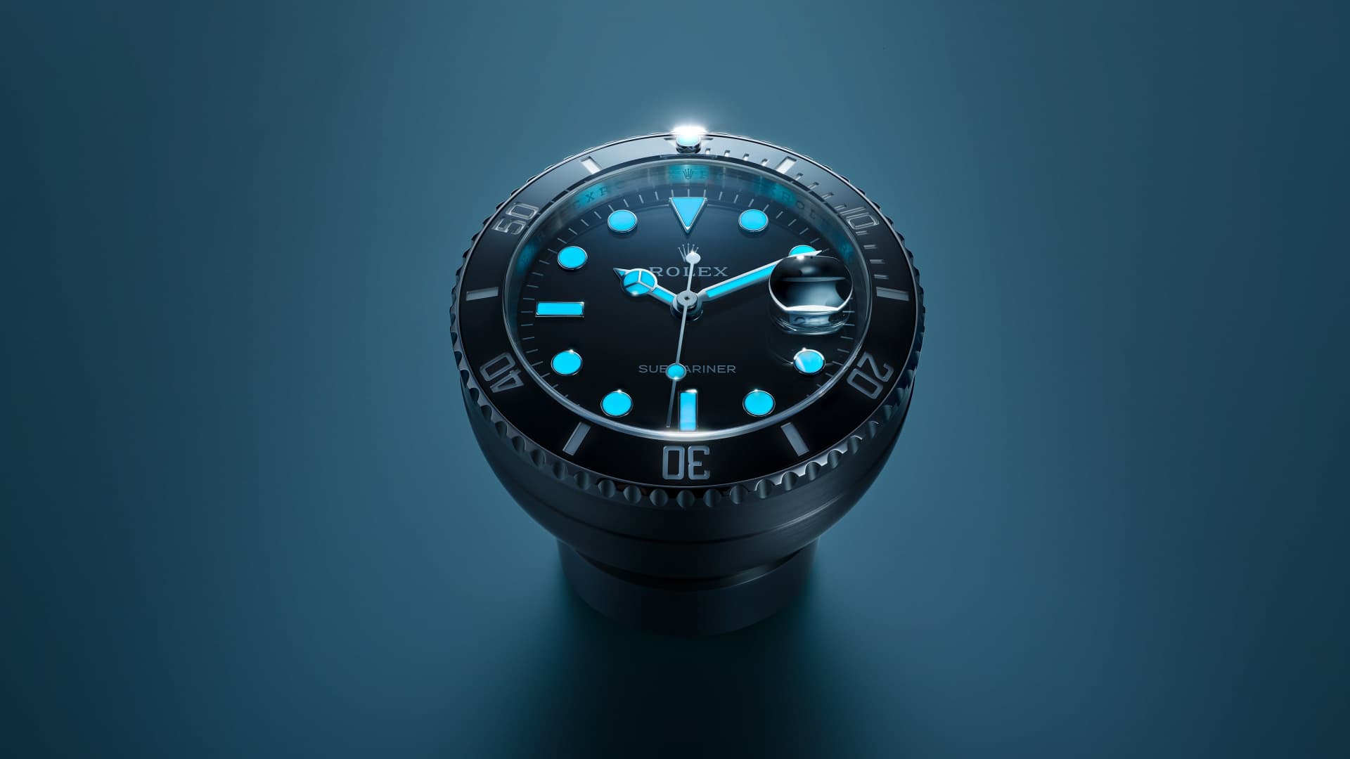 The Submariner desk clock in stainless steel, with a Cerachrom bezel insert and Chromalight display, incorporates a secular calendar.