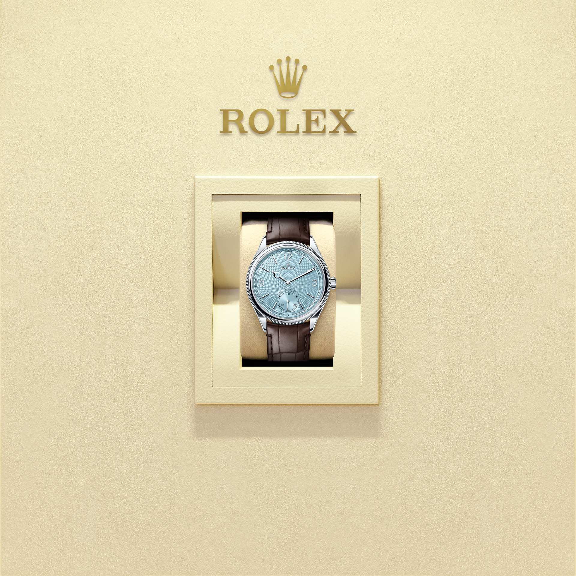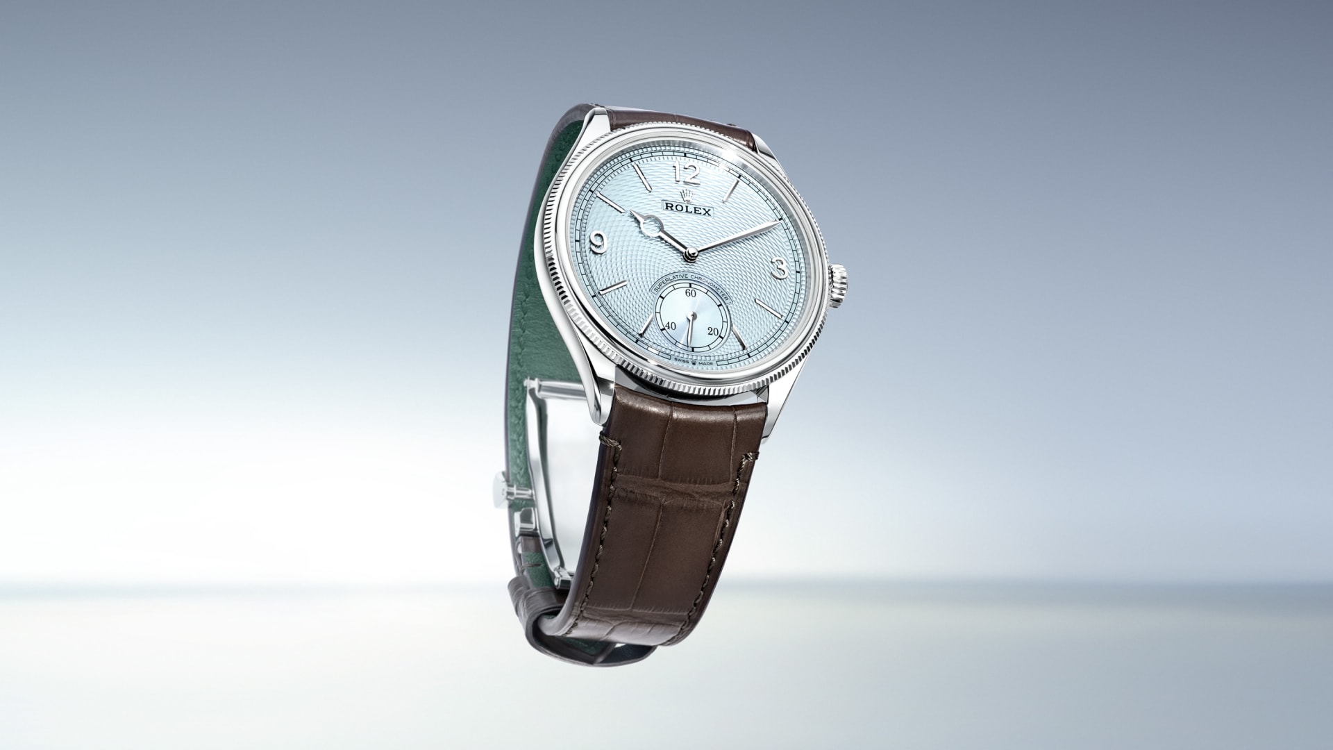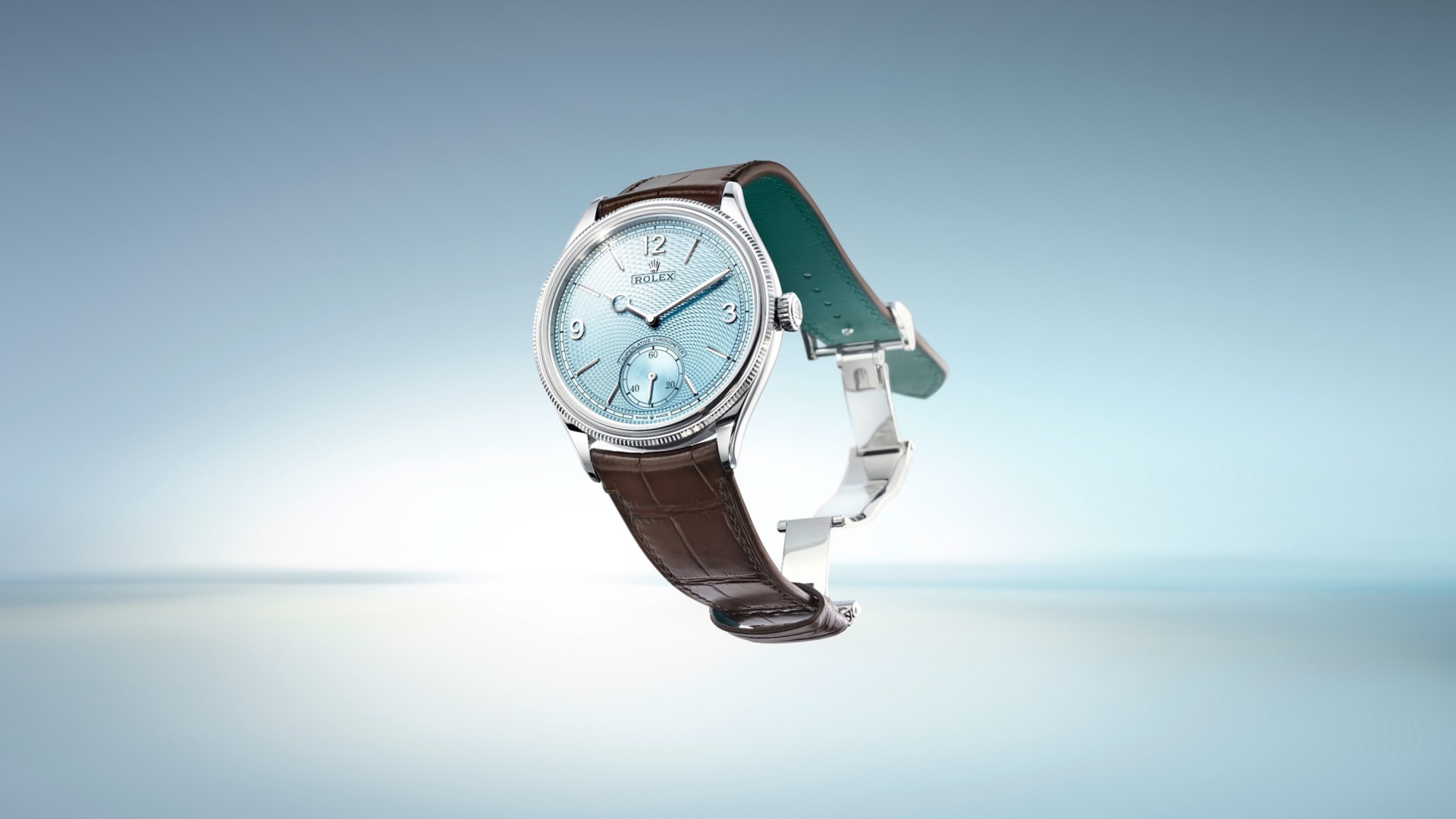 The ice blue dial features a guilloché rice-grain motif. This rosette-like design is distinctive for its three-dimensional, repeating geometric pattern that extends across the surface of the dial starting from the small seconds counter at 6 o’clock. The minute track is surrounded by a filet sauté with crimped pattern, which is also guilloché. With the introduction of a dial created via guillochage, or engine turning – a technique that uses a turning tool to sculpt a pattern into a surface – Rolex is pursuing the course it has set for the Perpetual collection as a tribute to the classic art of watchmaking infused with the brand’s know-how and creativity. This exclusive dial bears the same Arabic numerals 3, 9 and 12, the same faceted hour markers and the same hands as that of the 18 ct gold versions.