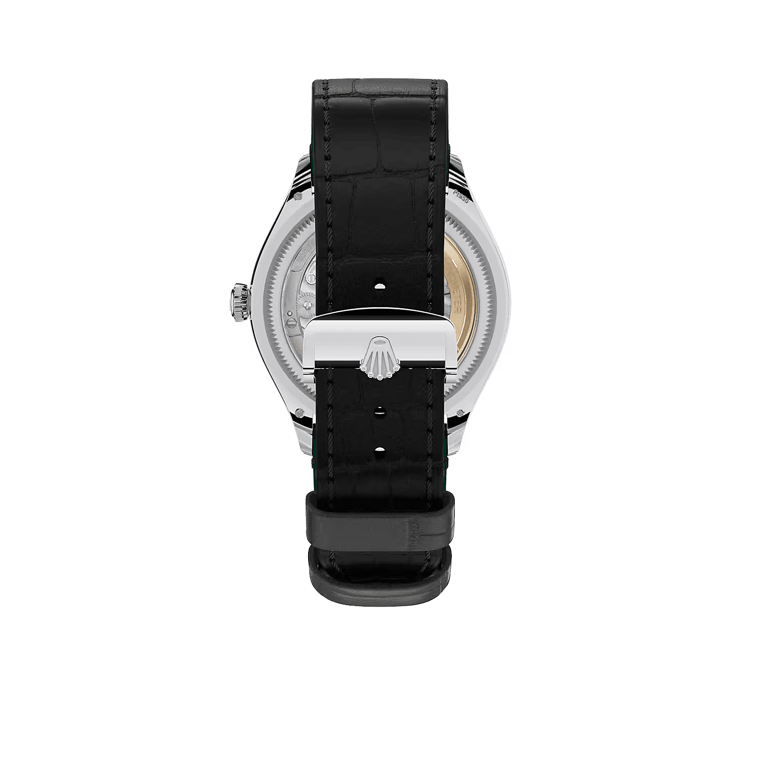 This 1908 version is fitted on an alligator leather strap. This elegant strap is distinctive for its green calfskin lining and tone-on-tone stitching.