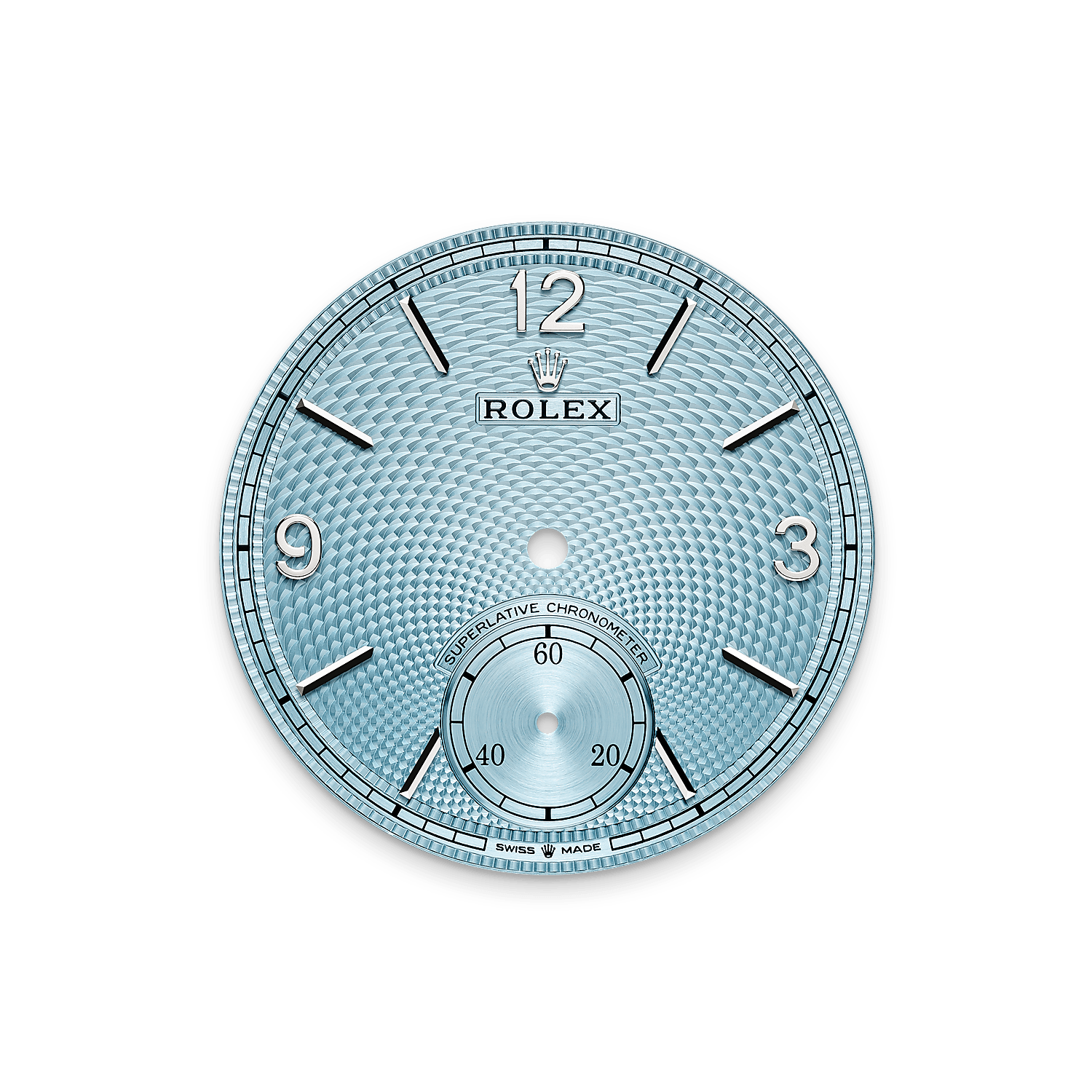 The ice blue dial features a guilloché rice-grain motif. This rosette-like design is distinctive for its three-dimensional, repeating geometric pattern that extends across the surface of the dial starting from the small seconds counter at 6 o’clock. The minute track is surrounded by a filet sauté with crimped pattern, which is also guilloché. With the introduction of a dial created via guillochage, or engine turning – a technique that uses a turning tool to sculpt a pattern into a surface – Rolex is pursuing the course it has set for the Perpetual collection as a tribute to the classic art of watchmaking infused with the brand’s know-how and creativity. This exclusive dial bears the same Arabic numerals 3, 9 and 12, the same faceted hour markers and the same hands as that of the 18 ct gold versions.