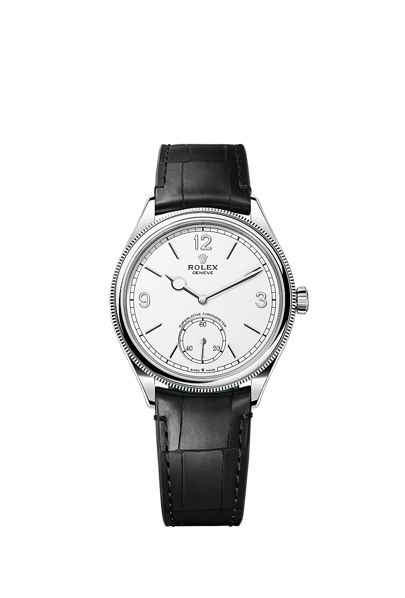 The Perpetual 1908 features a 39 mm case in 18 ct white gold with an alligator leather strap.