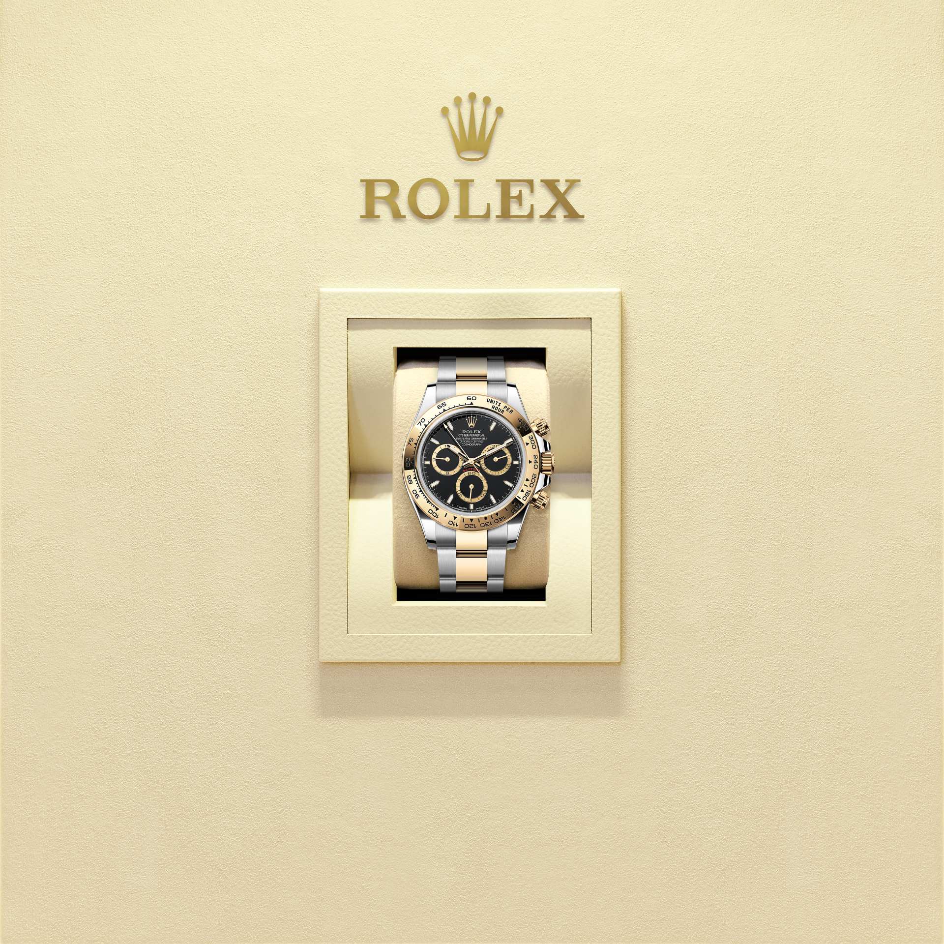 The Oyster Perpetual Cosmograph Daytona in Oystersteel and yellow gold with a black dial and contrasting counter rings. It features an Oyster bracelet and a yellow gold bezel with an engraved tachymetric scale.