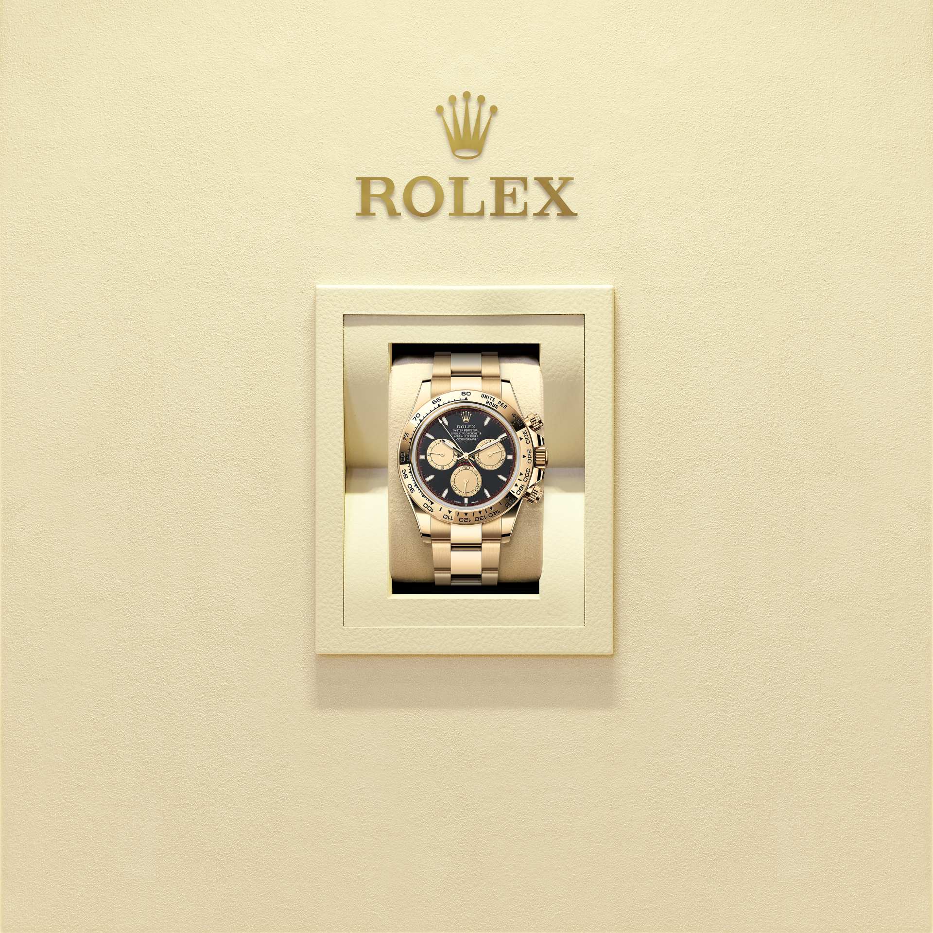 This Oyster Perpetual Cosmograph Daytona in 18 ct yellow gold, with an intense black and champagne-colour dial and an Oyster bracelet, features an 18 ct yellow gold bezel with an engraved tachymetric scale.