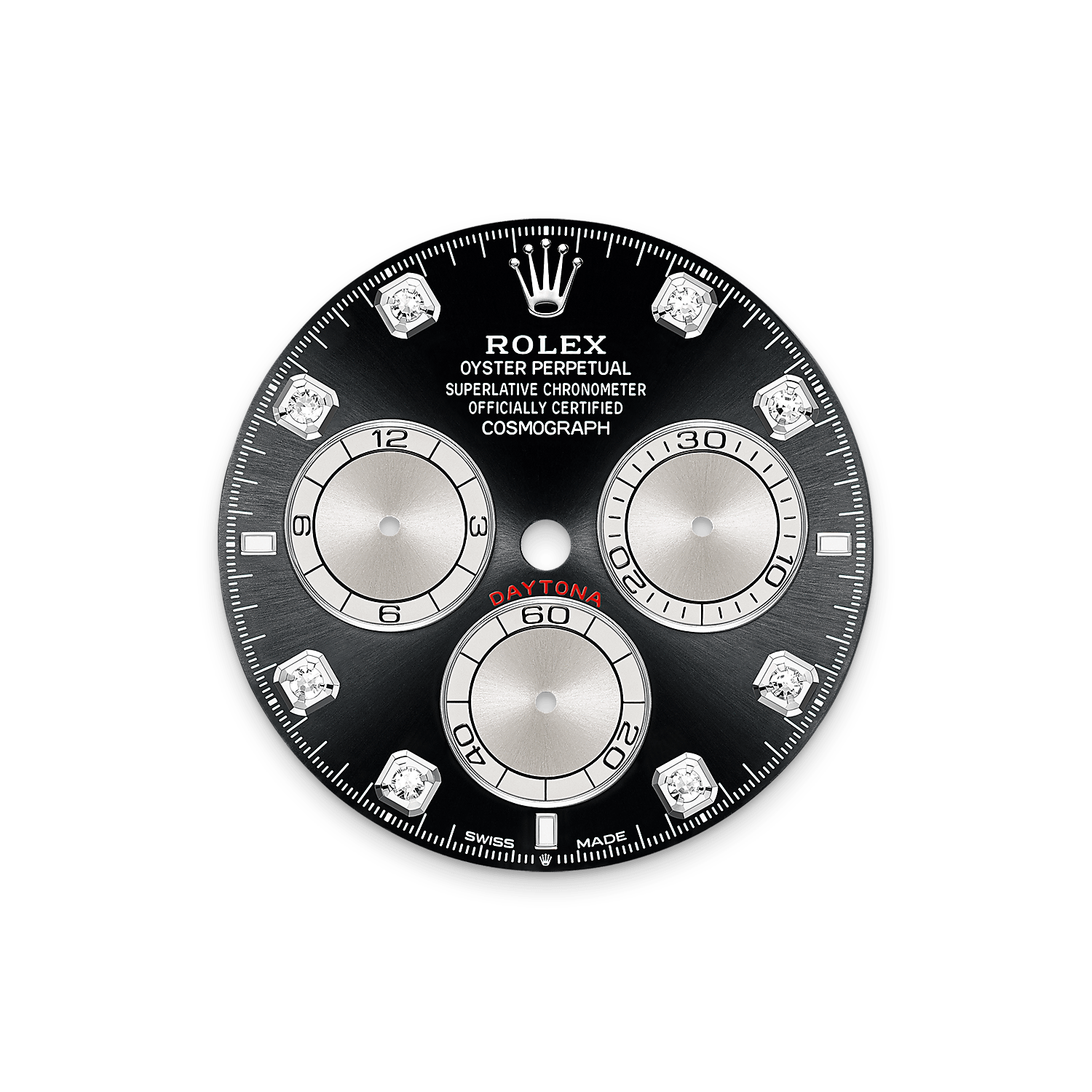 This Oyster Perpetual Cosmograph Daytona in 18 ct white gold, with a bright black and steel, diamond-set dial and an Oyster bracelet, features an 18 ct white gold bezel with an engraved tachymetric scale.