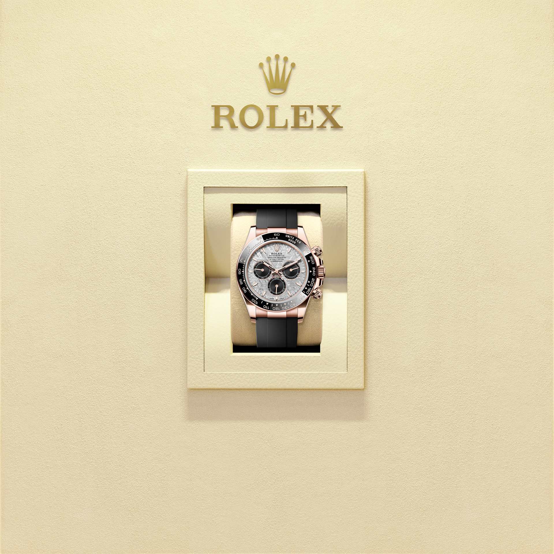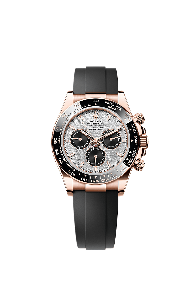 This Oyster Perpetual Cosmograph Daytona in 18 ct Everose gold, with a meteorite and black dial and an Oysterflex bracelet, features a black Cerachrom bezel with tachymetric scale.