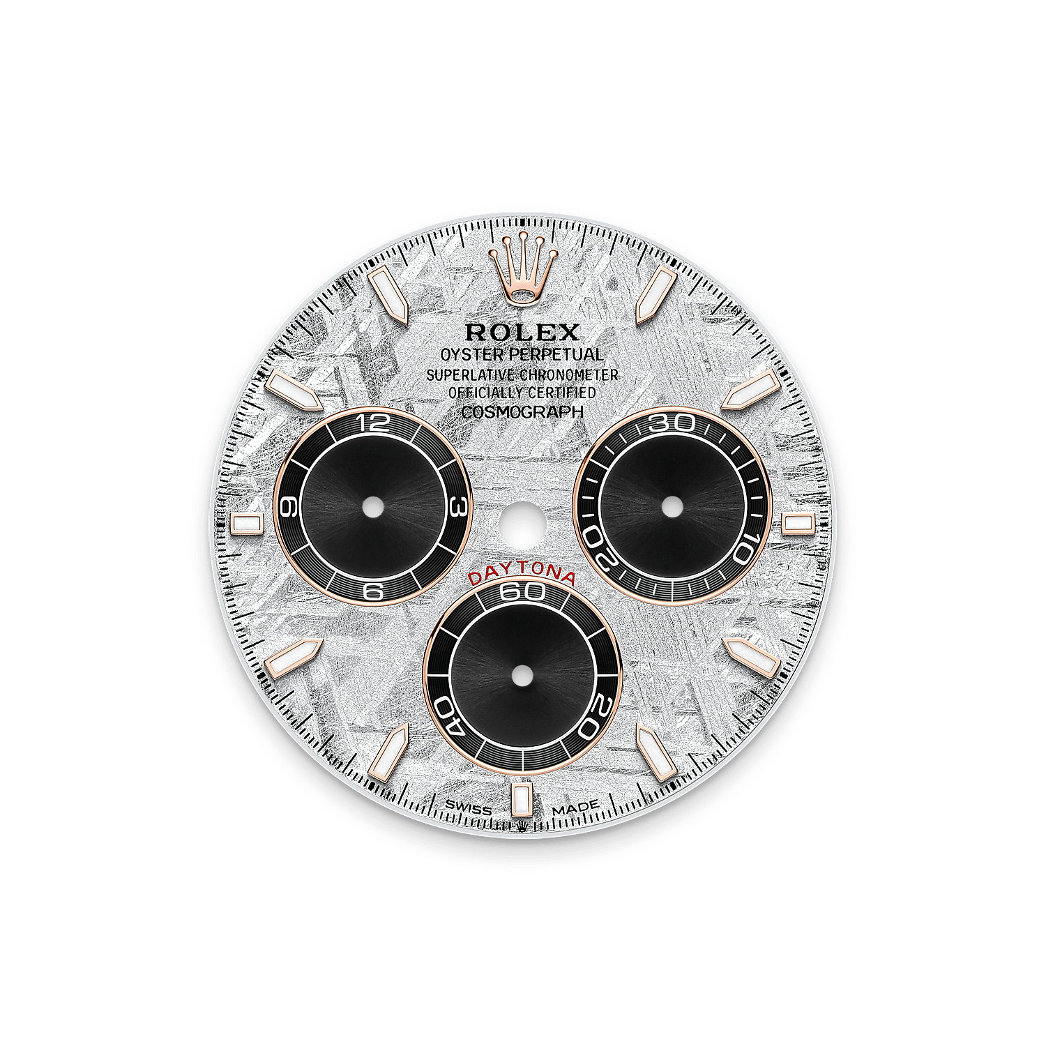 During its journey, the centre of the meteorite is gradually transformed, producing highly unusual metallic patterns, resulting from the very slow cooling of molten asteroid cores. The designers at Rolex create from these configurations a unique treasure for some of the most prestigious models, including this Cosmograph Daytona.