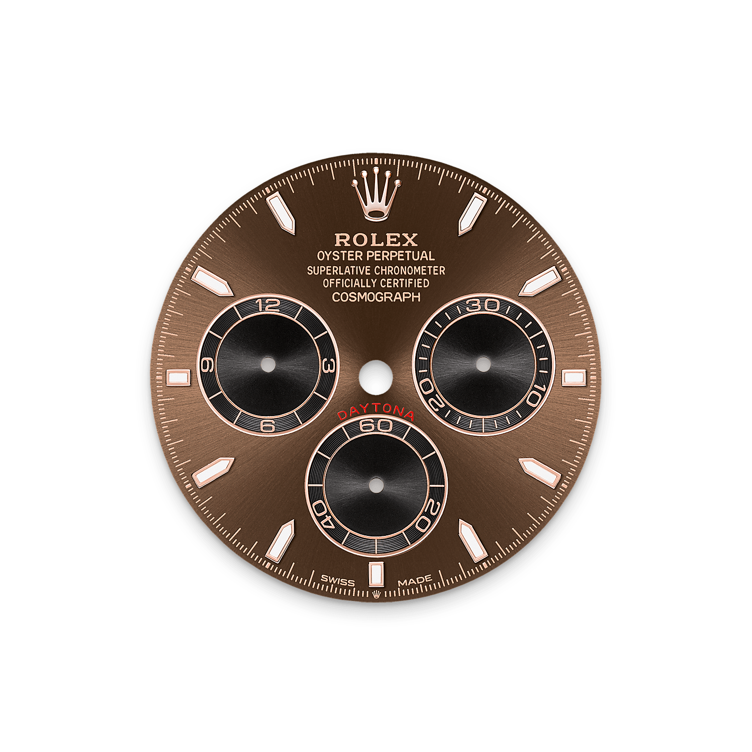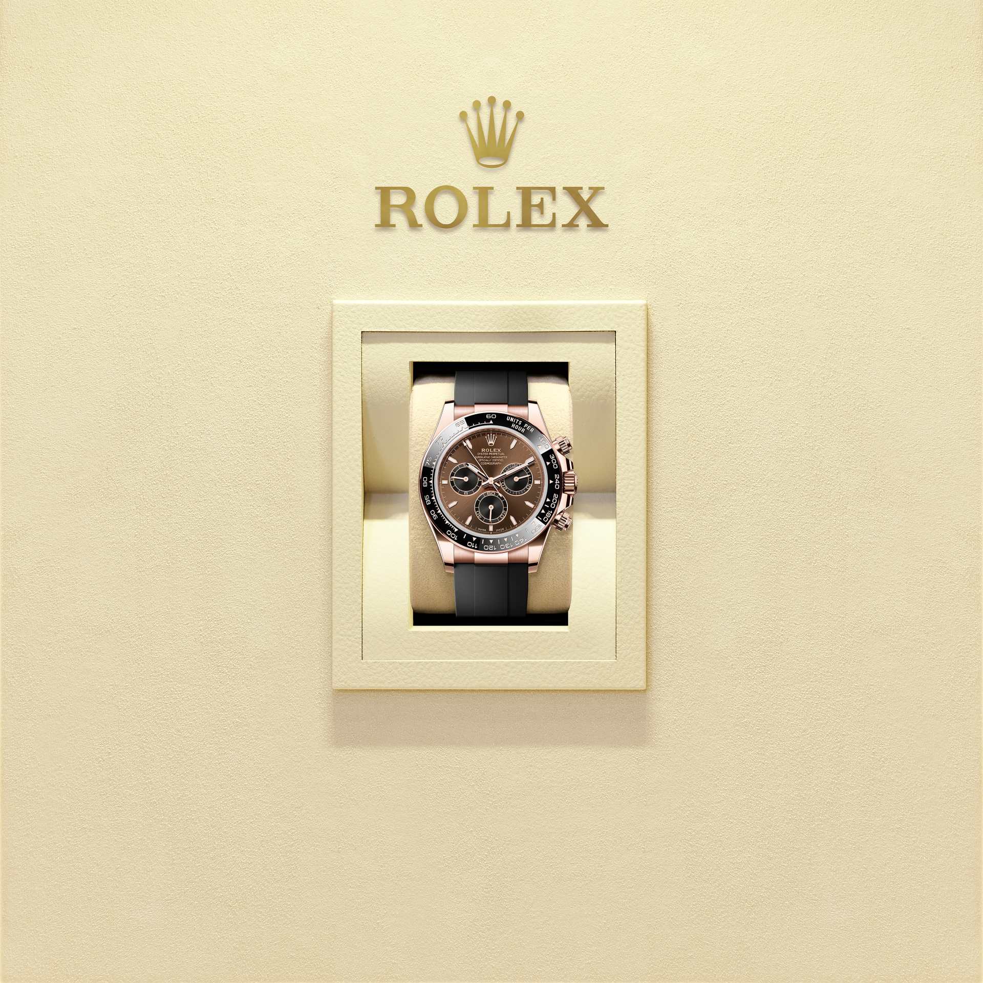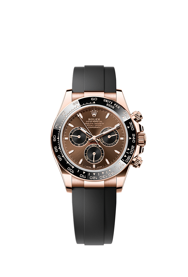 This Oyster Perpetual Cosmograph Daytona in 18 ct Everose gold, with a chocolate and black dial and an Oysterflex bracelet, features a black Cerachrom bezel with tachymetric scale.