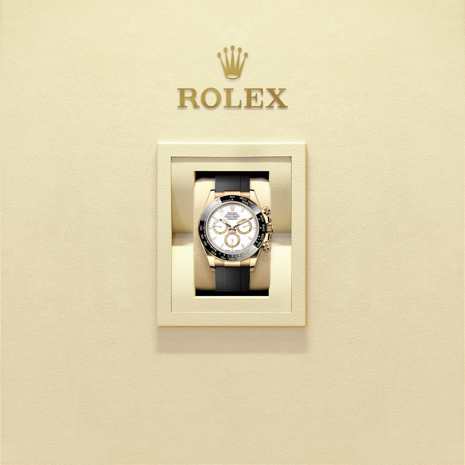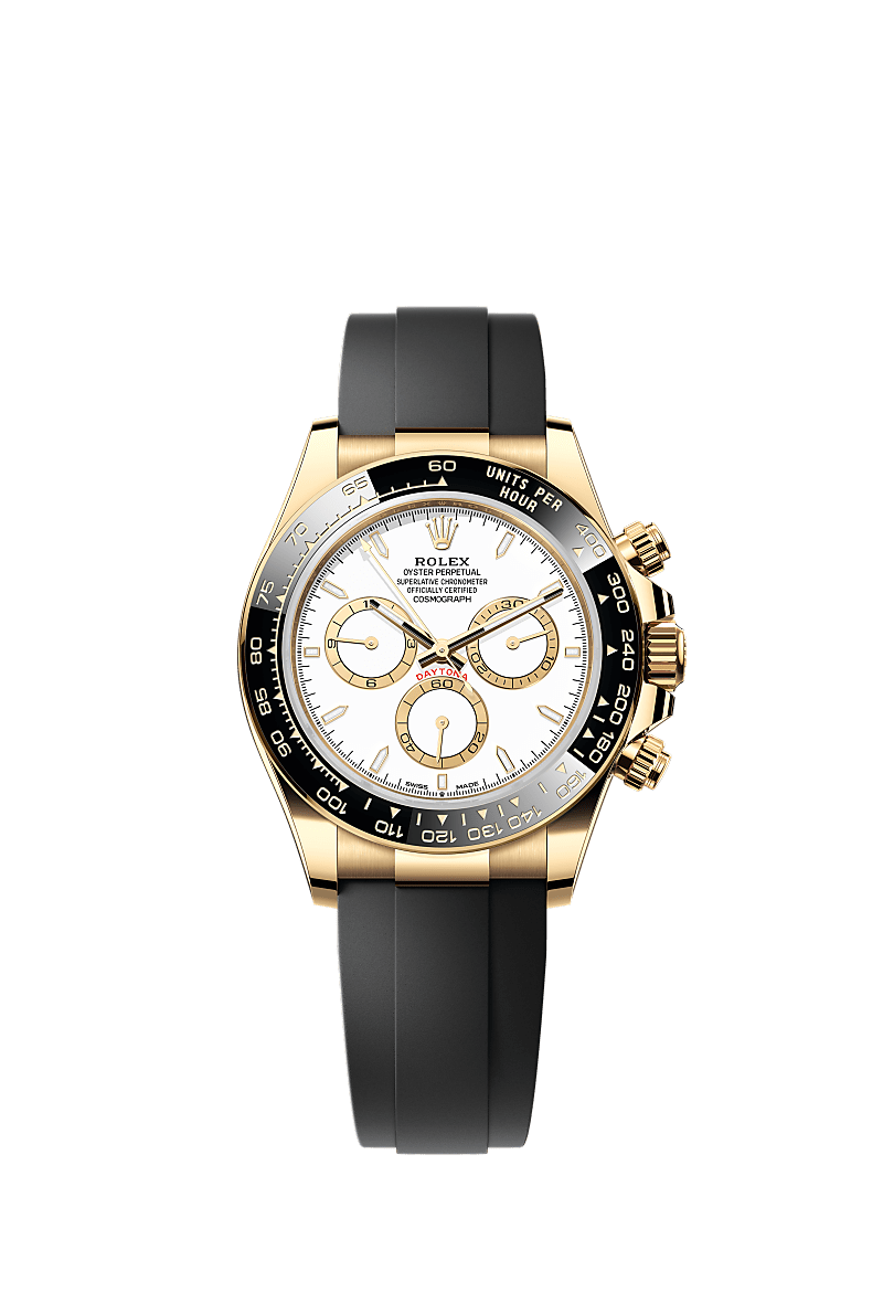 The Oyster Perpetual Cosmograph Daytona in 18 ct yellow gold with a white dial and contrasting counter rings. It features an Oysterflex bracelet and a black Cerachrom bezel with tachymetric scale.
