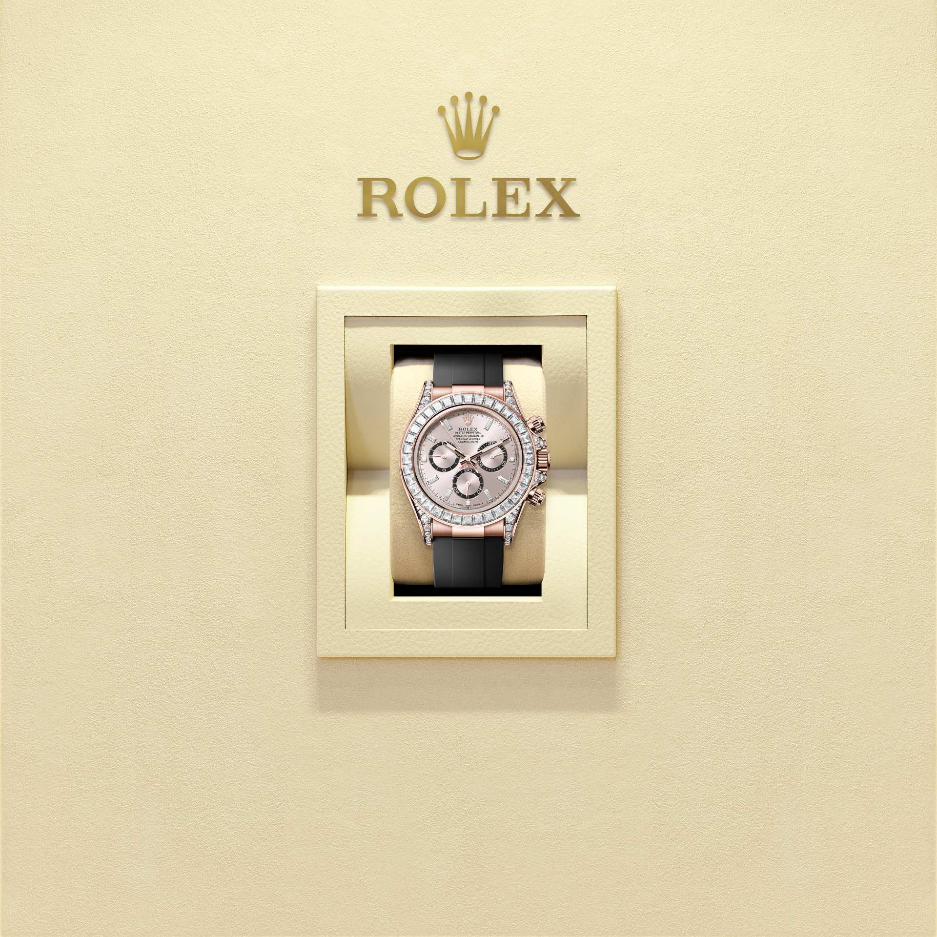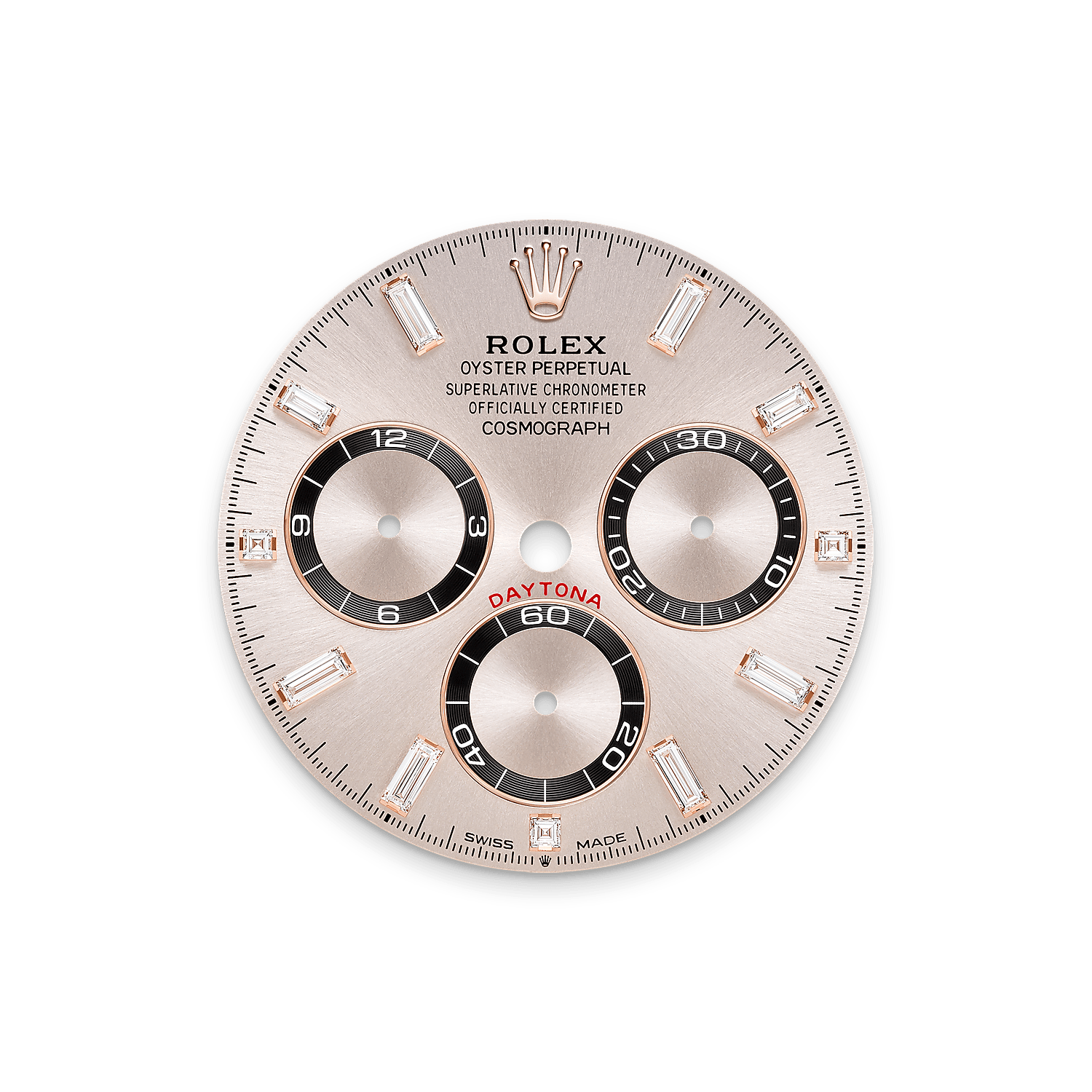 This Oyster Perpetual Cosmograph Daytona in 18 ct Everose gold, with a Sundust, diamond-set dial and contrasting counter rings, features an Oysterflex bracelet as well as a diamond-set bezel and diamond-set lugs.
