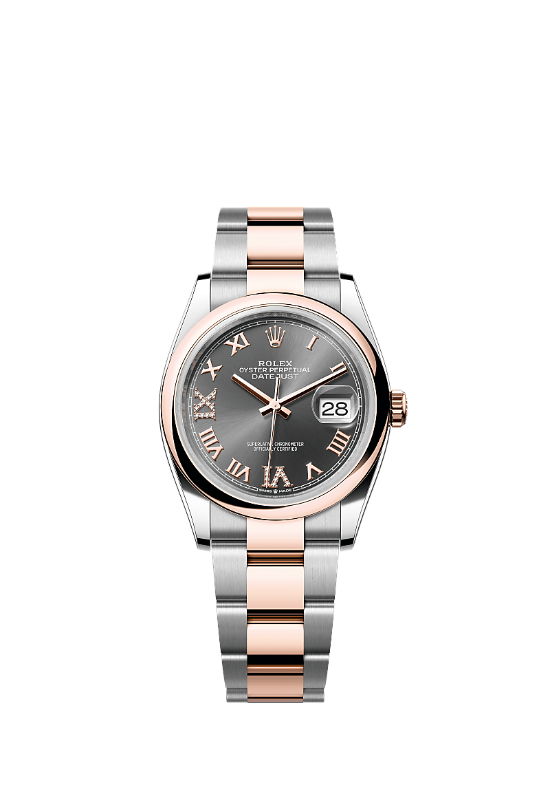 This Oyster Perpetual Datejust 36 in Oystersteel and Everose gold features a slate, diamond-set dial and an Oyster bracelet.