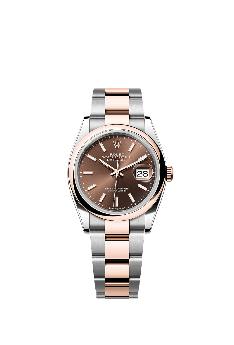This Oyster Perpetual Datejust 36 in Oystersteel and Everose gold features a chocolate dial and an Oyster bracelet.