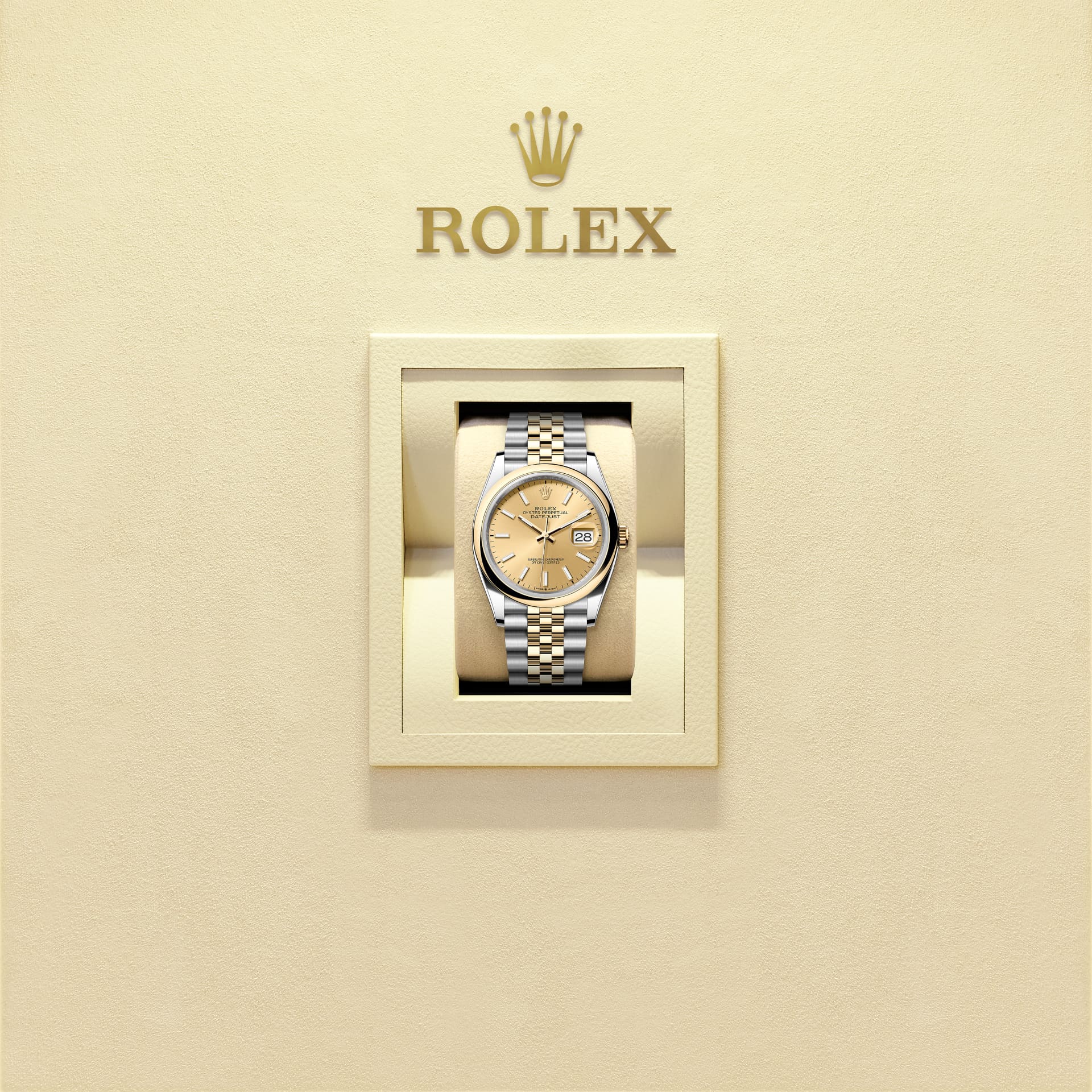 This Oyster Perpetual Datejust 36 in Oystersteel and yellow gold features a champagne-colour dial and a Jubilee bracelet.