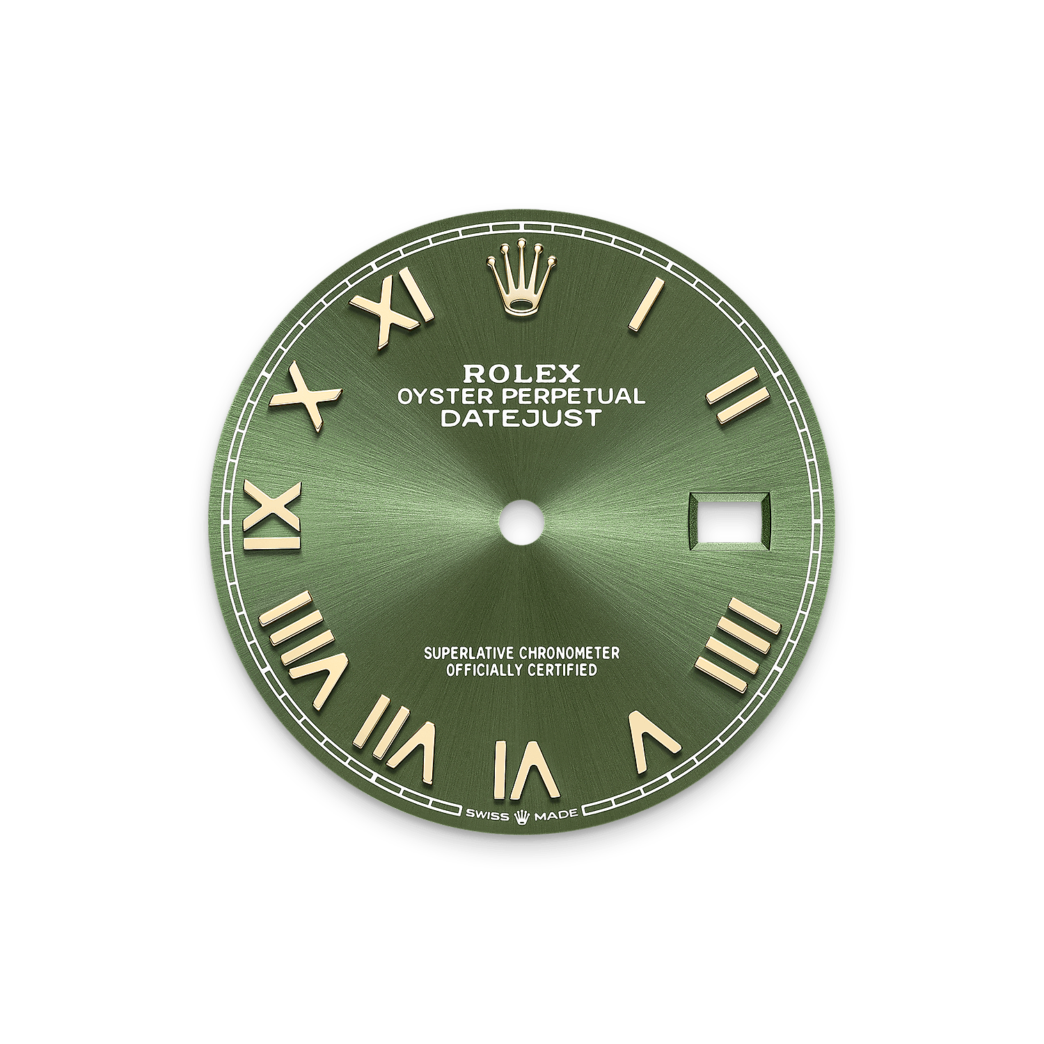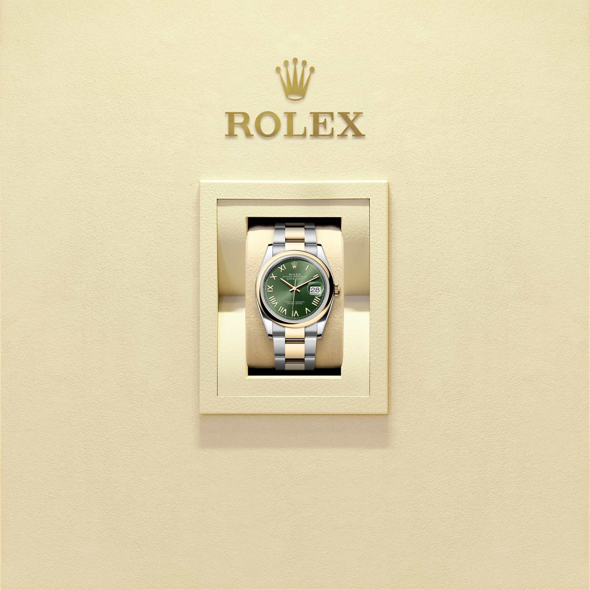 This Oyster Perpetual Datejust 36 in Oystersteel and yellow gold features an olive-green dial and an Oyster bracelet.