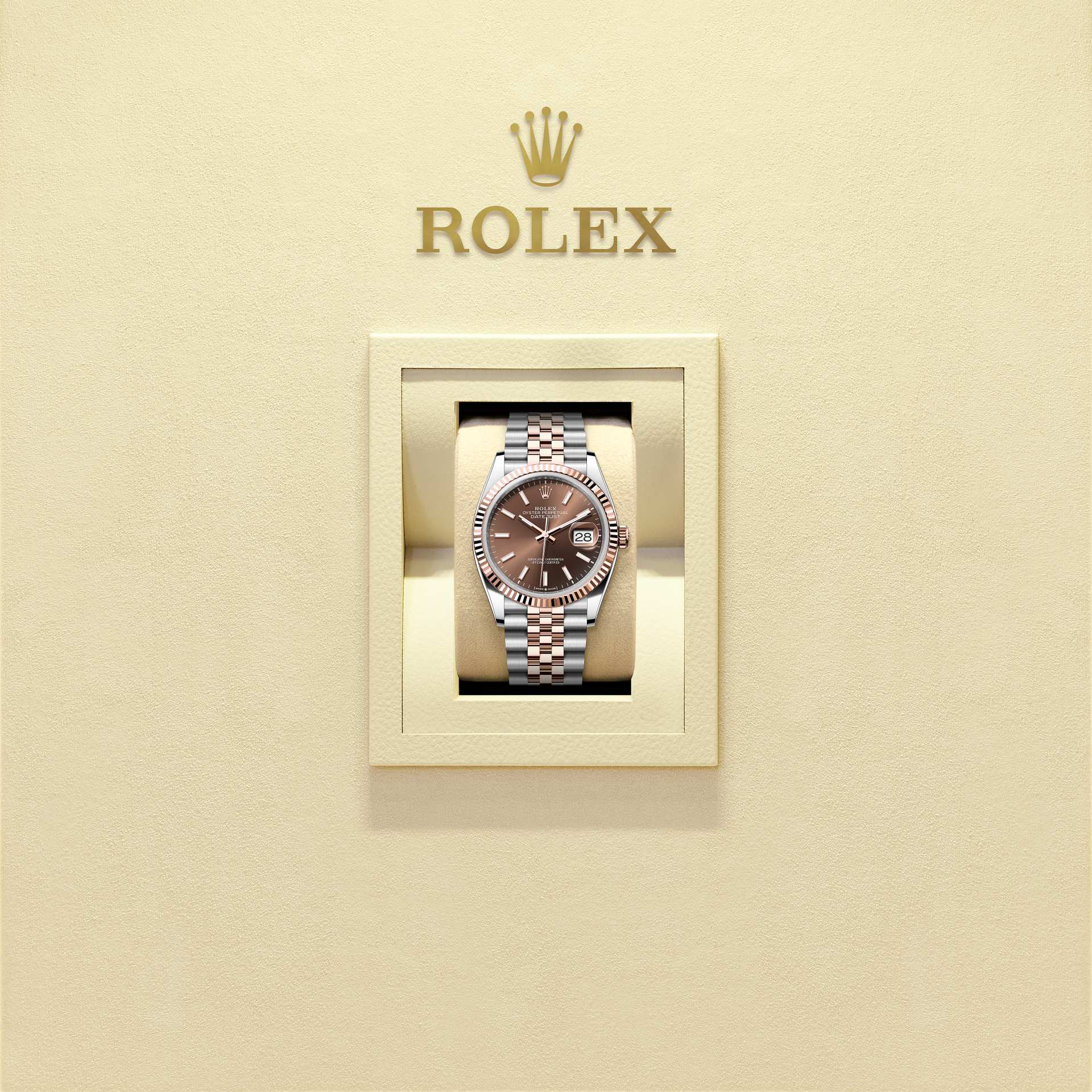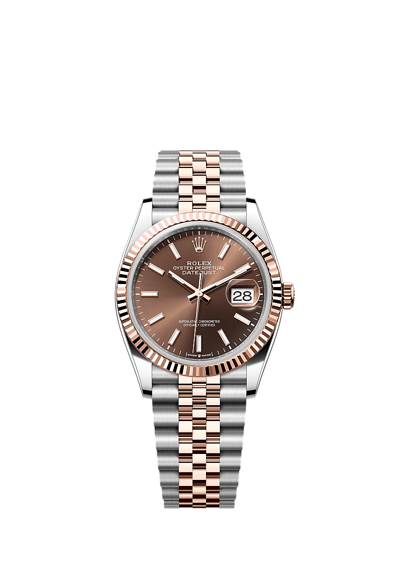This Oyster Perpetual Datejust 36 in Oystersteel and Everose gold features a chocolate dial and a Jubilee bracelet.