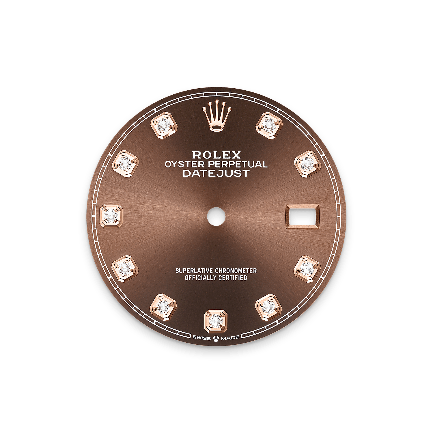 This dial features diamonds in 18 ct gold settings. The sunray finish creates delicate light reflections on many dials in the Oyster Perpetual collection. It is obtained using masterful brushing techniques that create grooves running outwards from the centre of the dial.