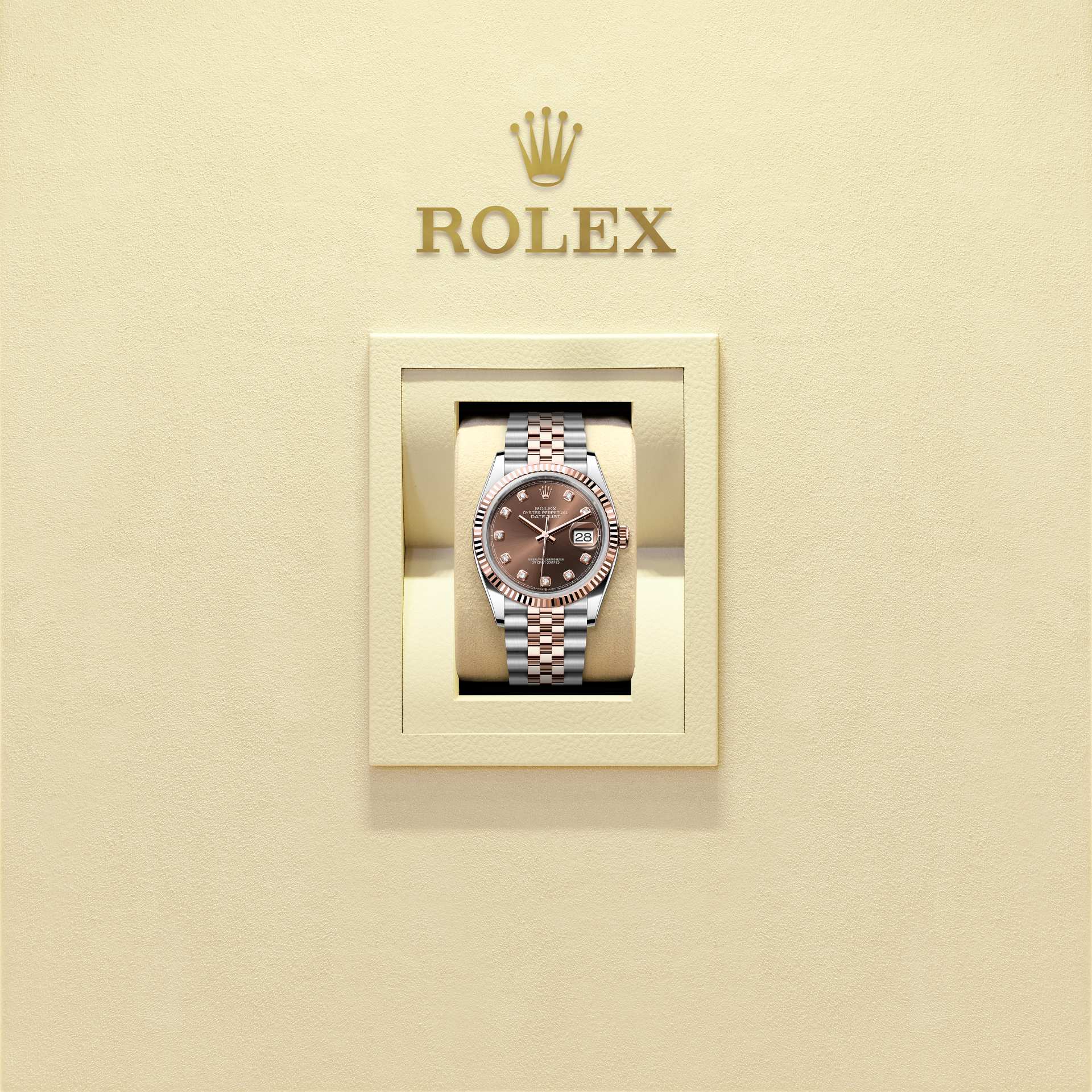This Oyster Perpetual Datejust 36 in Oystersteel and Everose gold features a chocolate, diamond-set dial and a Jubilee bracelet.