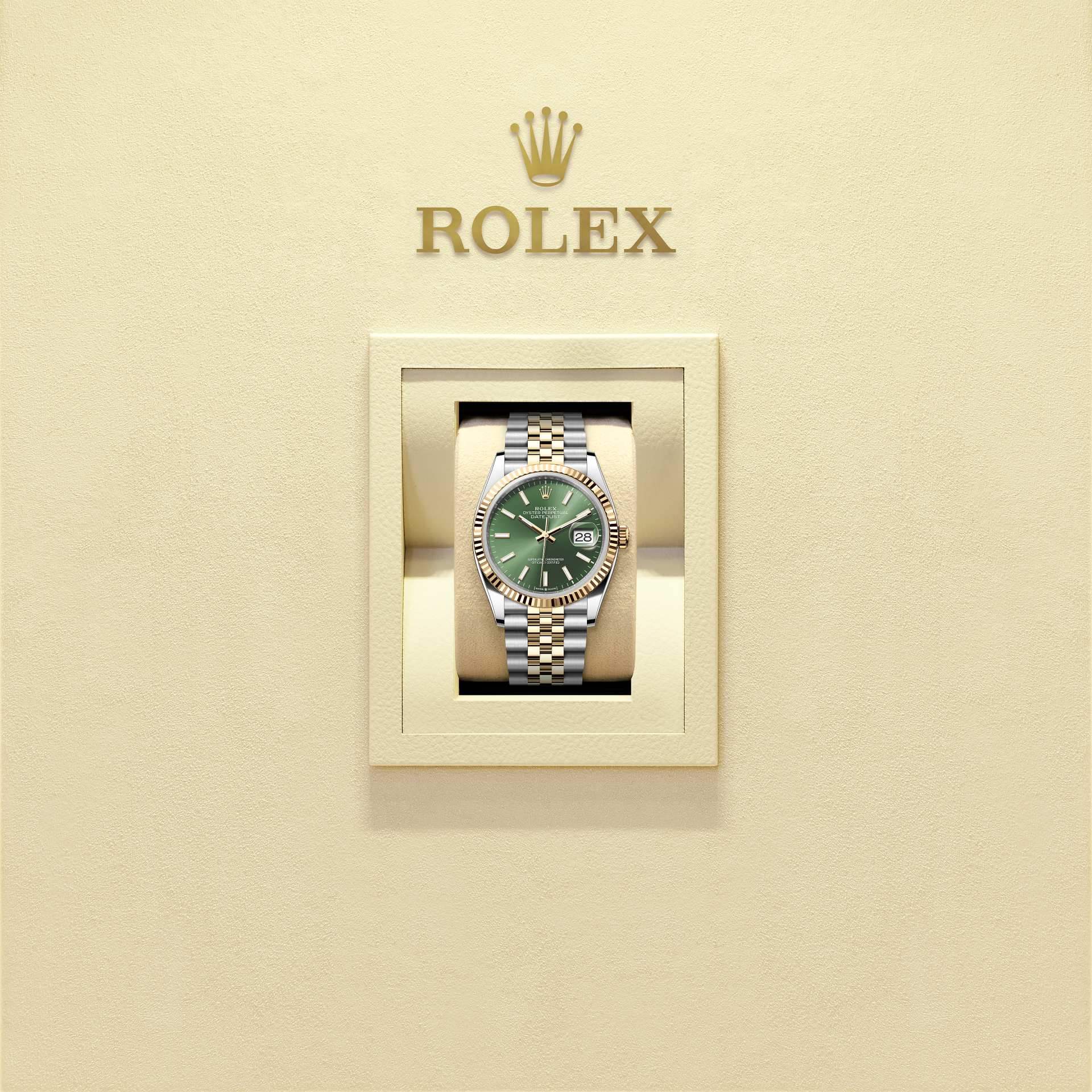 This Oyster Perpetual Datejust 36 in Oystersteel and yellow gold features an olive green dial and an Oyster bracelet.