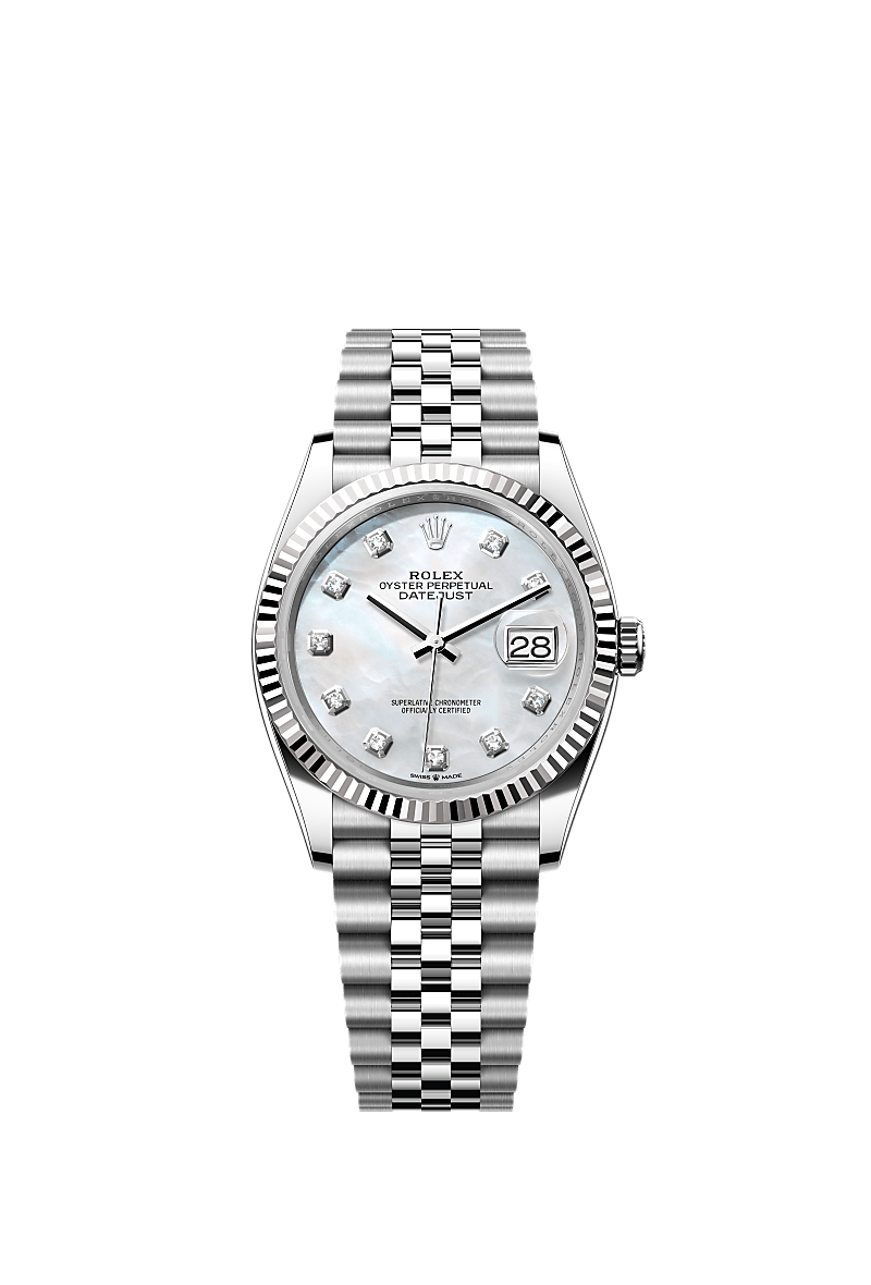 This Oyster Perpetual Datejust 36 in Oystersteel and white gold features a white mother-of-pearl, diamond-set dial and a Jubilee bracelet.