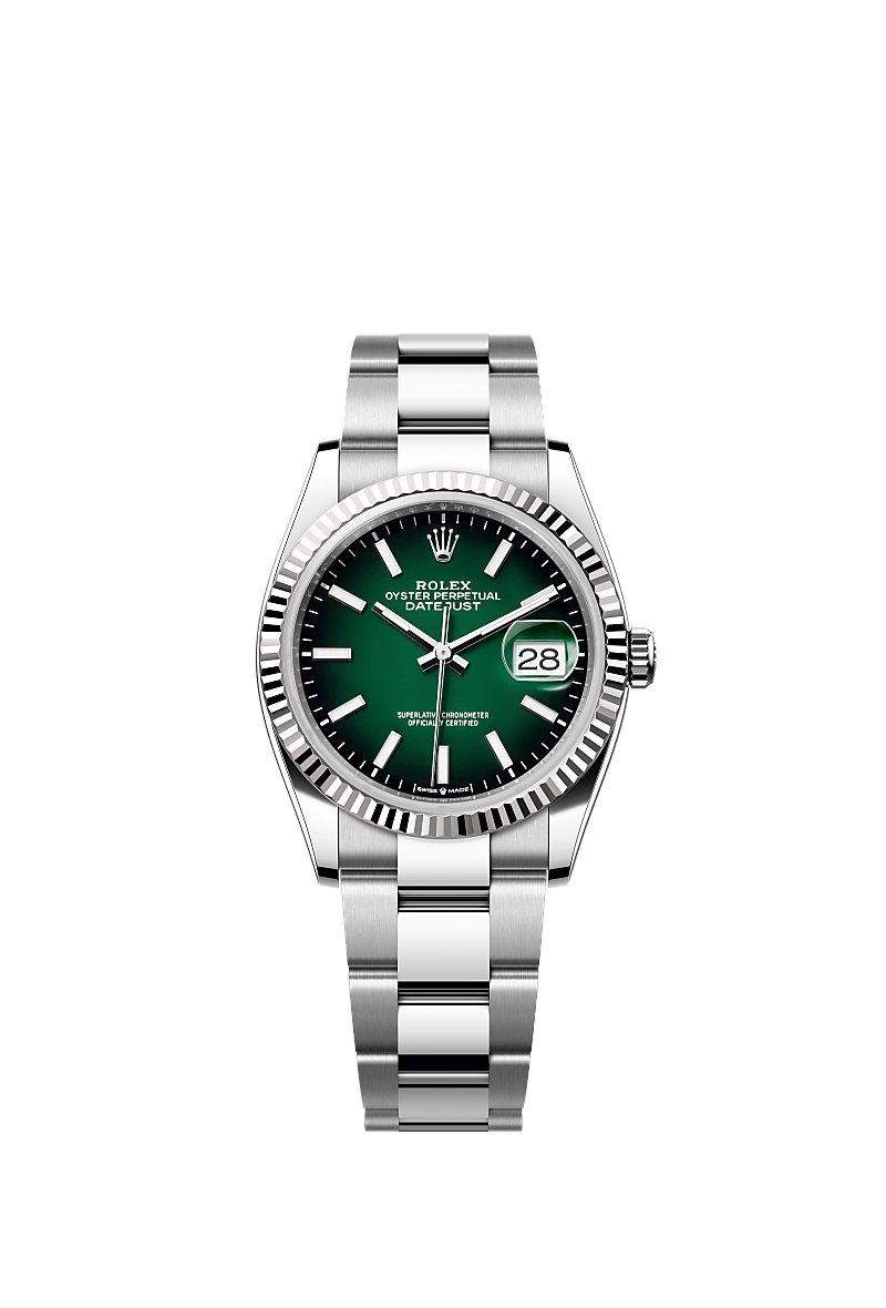 This Oyster Perpetual Datejust 36 in Oystersteel and white gold features a green ombré dial and an Oyster bracelet.