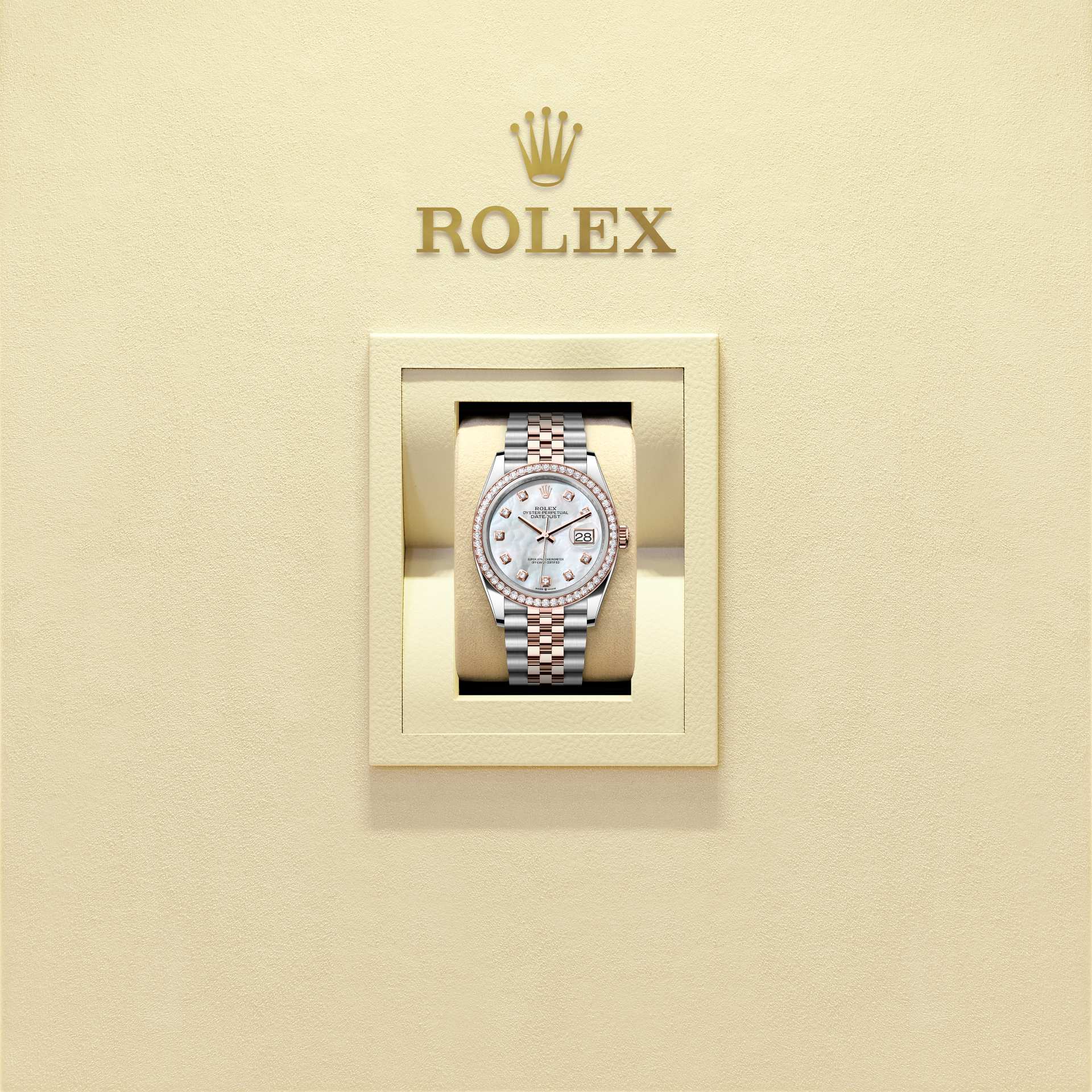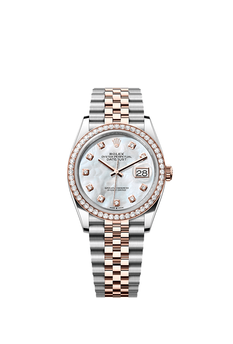 This Oyster Perpetual Datejust 36 in Oystersteel and Everose gold features a white mother-of-pearl, diamond-set dial and a Jubilee bracelet.