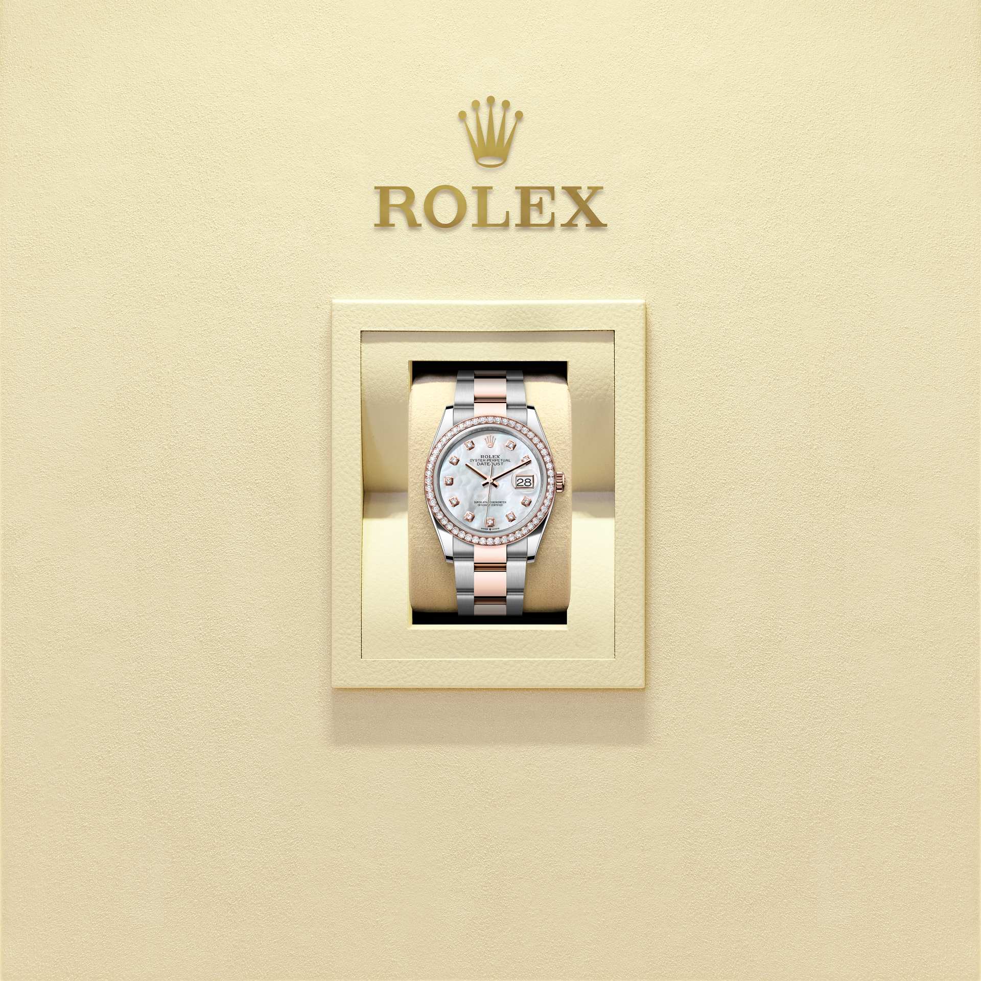 This Oyster Perpetual Datejust 36 in Oystersteel and Everose gold features a white mother-of-pearl, diamond-set dial and an Oyster bracelet.