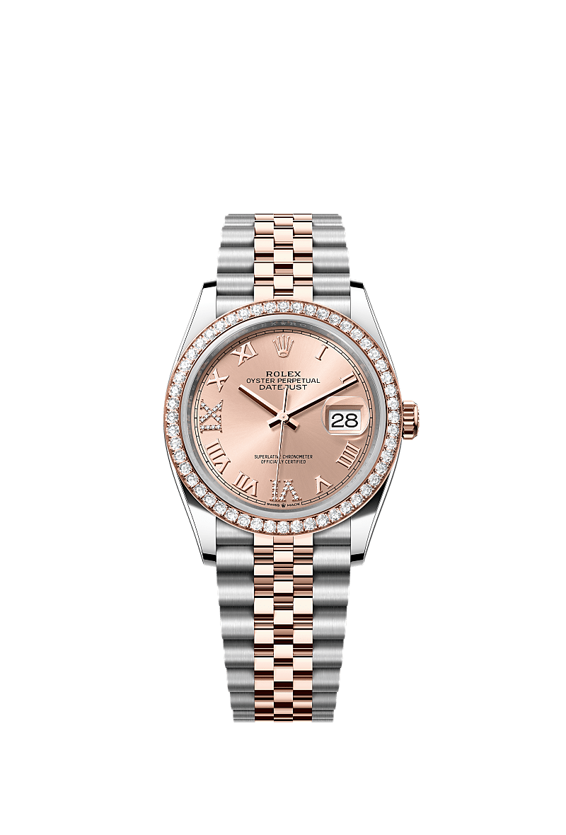 This Oyster Perpetual Datejust 36 in Oystersteel and Everose gold features a rosé colour, diamond-set dial and a Jubilee bracelet.