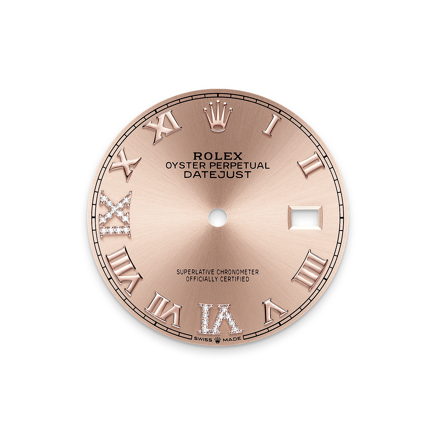 This dial features a Roman VI and IX in 18 ct gold, set with 24 diamonds. The sunray finish creates delicate light reflections on many dials in the Oyster Perpetual collection. It is obtained using masterful brushing techniques that create grooves running outwards from the centre of the dial.