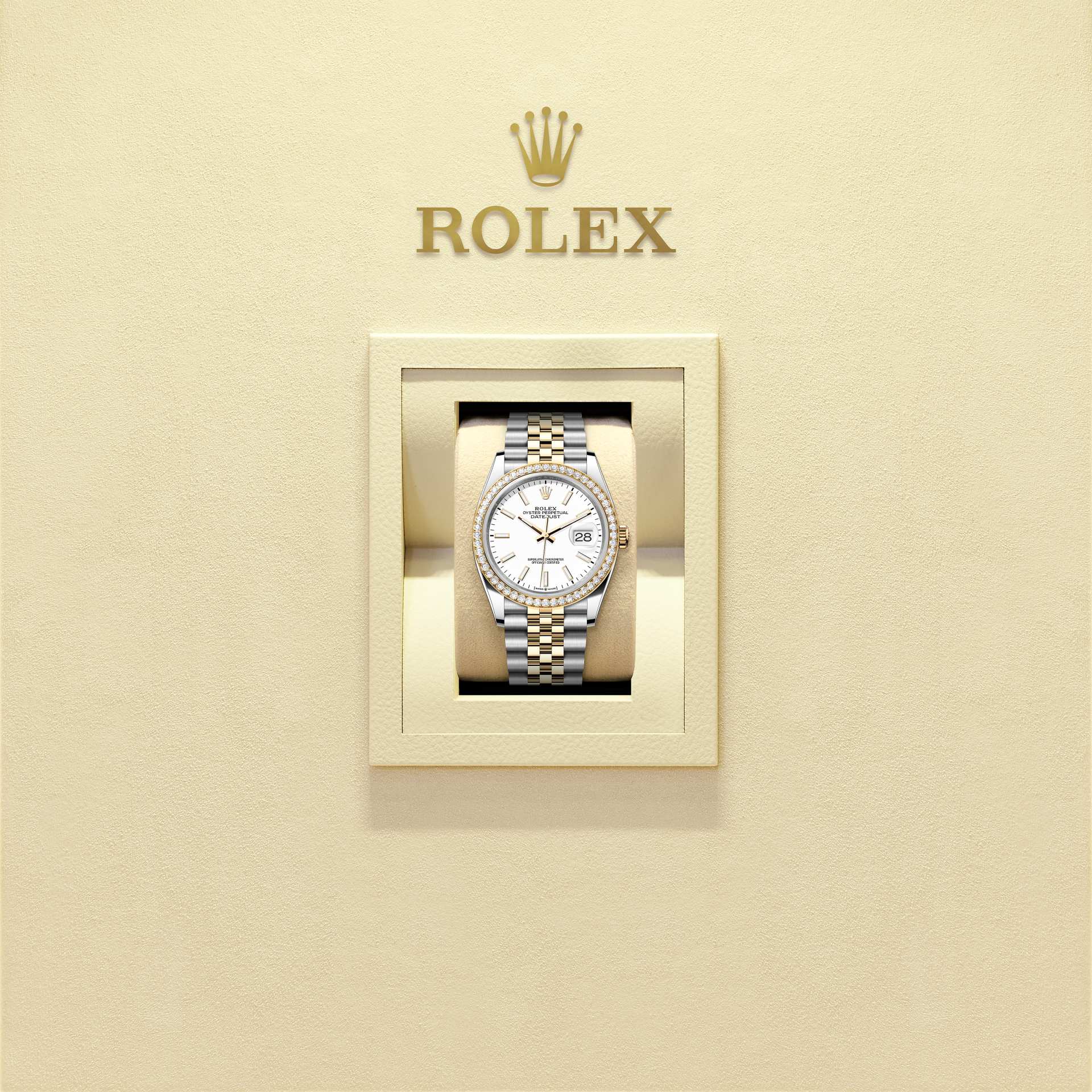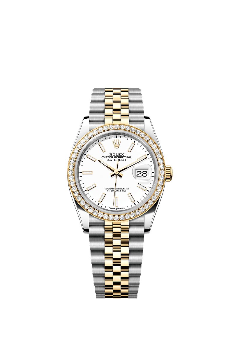 This Oyster Perpetual Datejust 36 in Oystersteel and yellow gold features a white dial and a Jubilee bracelet.