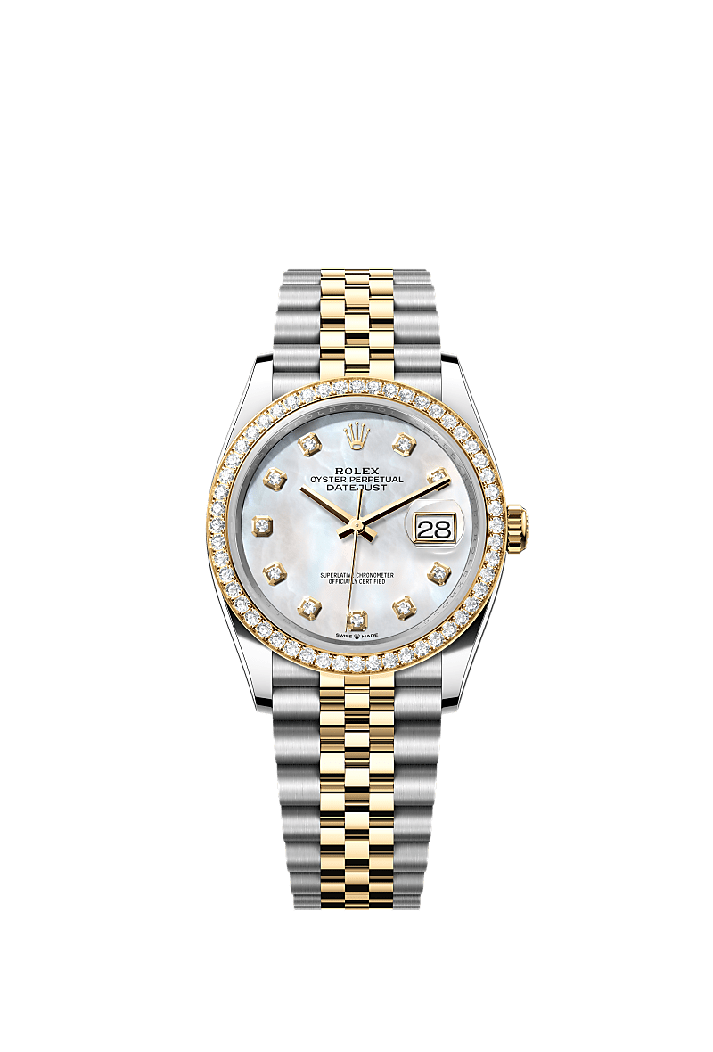 This Oyster Perpetual Datejust 36 in Oystersteel and yellow gold features a white mother-of-pearl, diamond-set dial and a Jubilee bracelet.