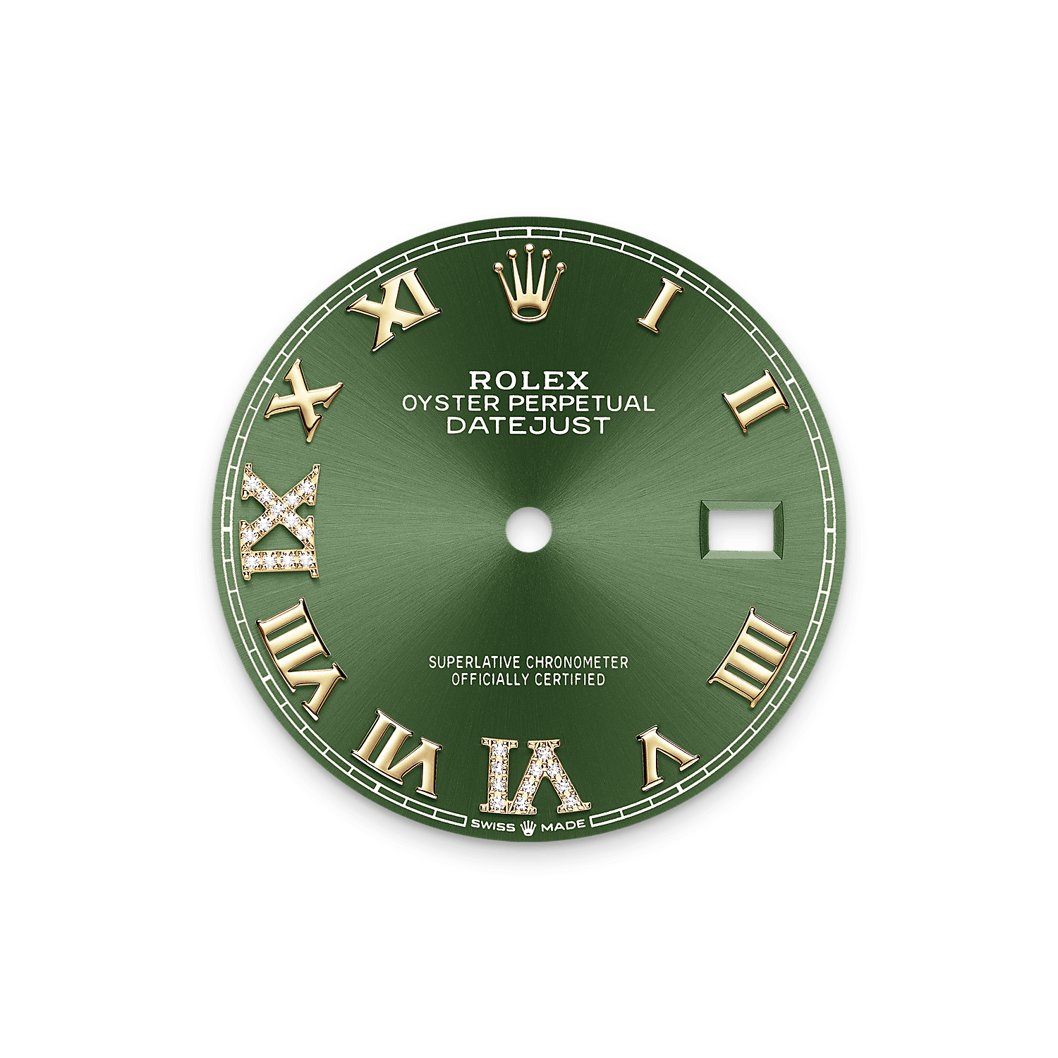 This dial features a Roman VI and IX in 18 ct gold, set with 24 diamonds. The sunray finish creates delicate light reflections on many dials in the Oyster Perpetual collection. It is obtained using masterful brushing techniques that create grooves running outwards from the centre of the dial.