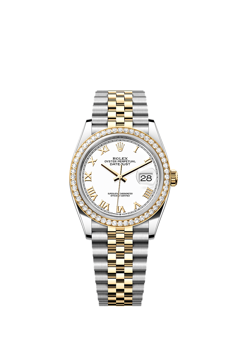 This Oyster Perpetual Datejust 36 in Oystersteel and yellow gold features a white dial and a Jubilee bracelet.