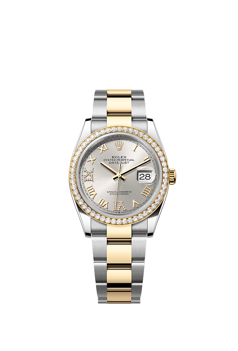 This Oyster Perpetual Datejust 36 in Oystersteel and yellow gold features a silver, diamond-set dial and an Oyster bracelet.