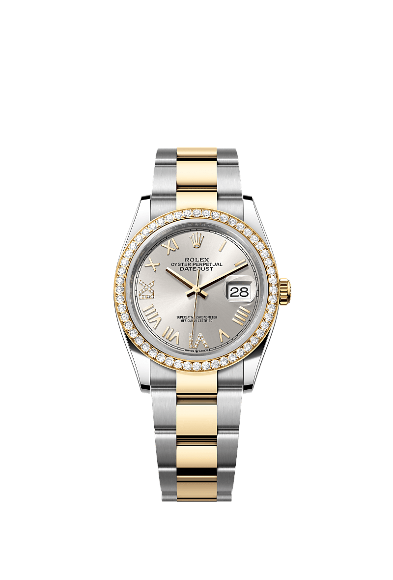 This Oyster Perpetual Datejust 36 in Oystersteel and yellow gold features a silver, diamond-set dial and an Oyster bracelet.