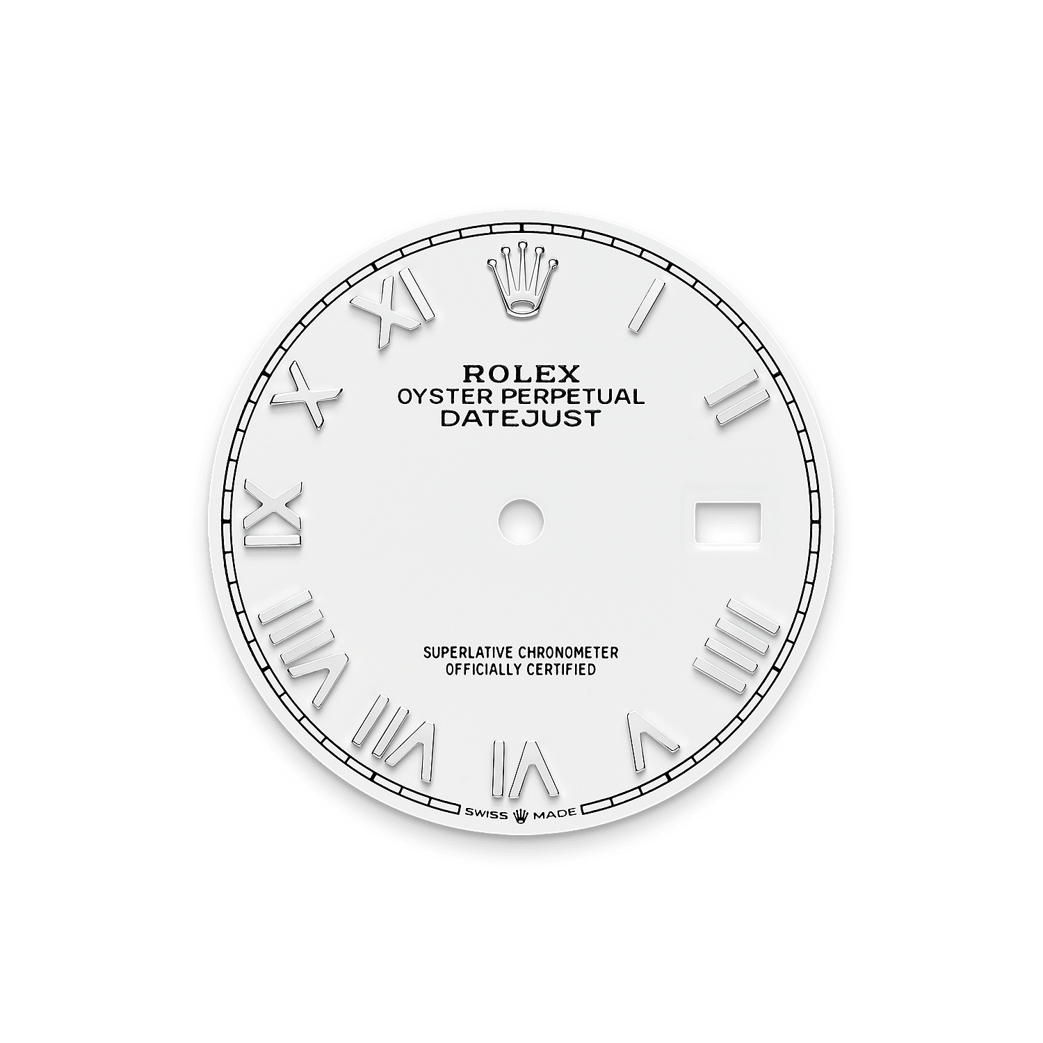 This Oyster Perpetual Datejust 36 in Oystersteel and white gold features a white dial and an Oyster bracelet.