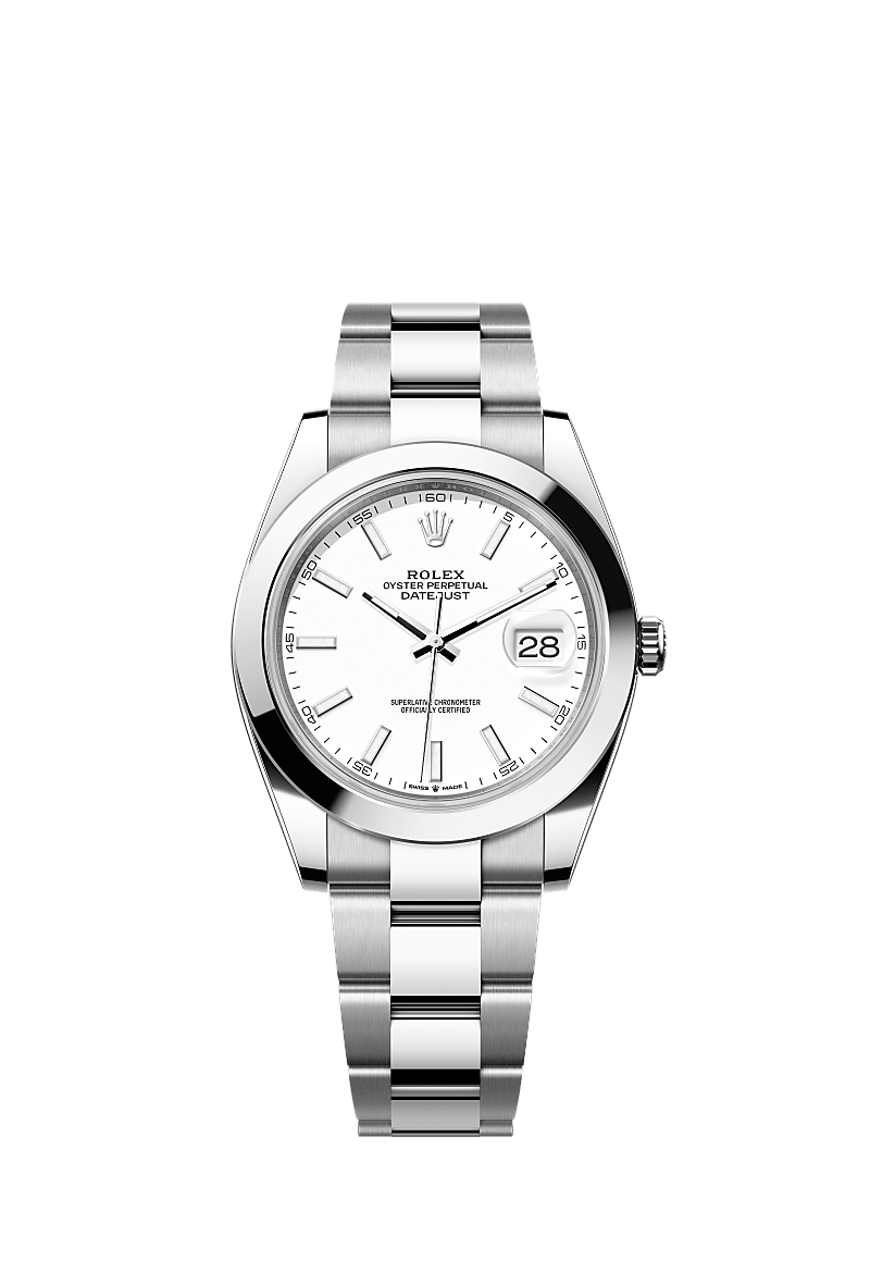 This Oyster Perpetual Datejust 41 in Oystersteel features a white dial and an Oyster bracelet.