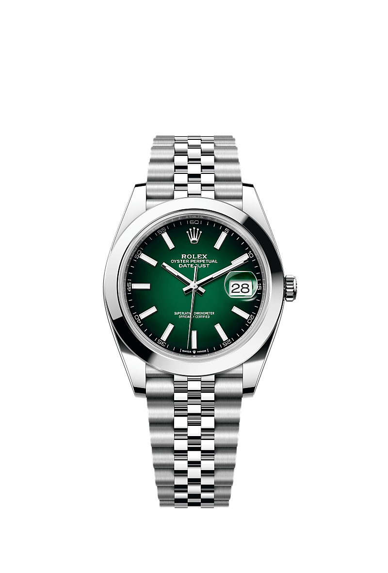 This Oyster Perpetual Datejust 41 in Oystersteel features a green ombré dial and a Jubilee bracelet.