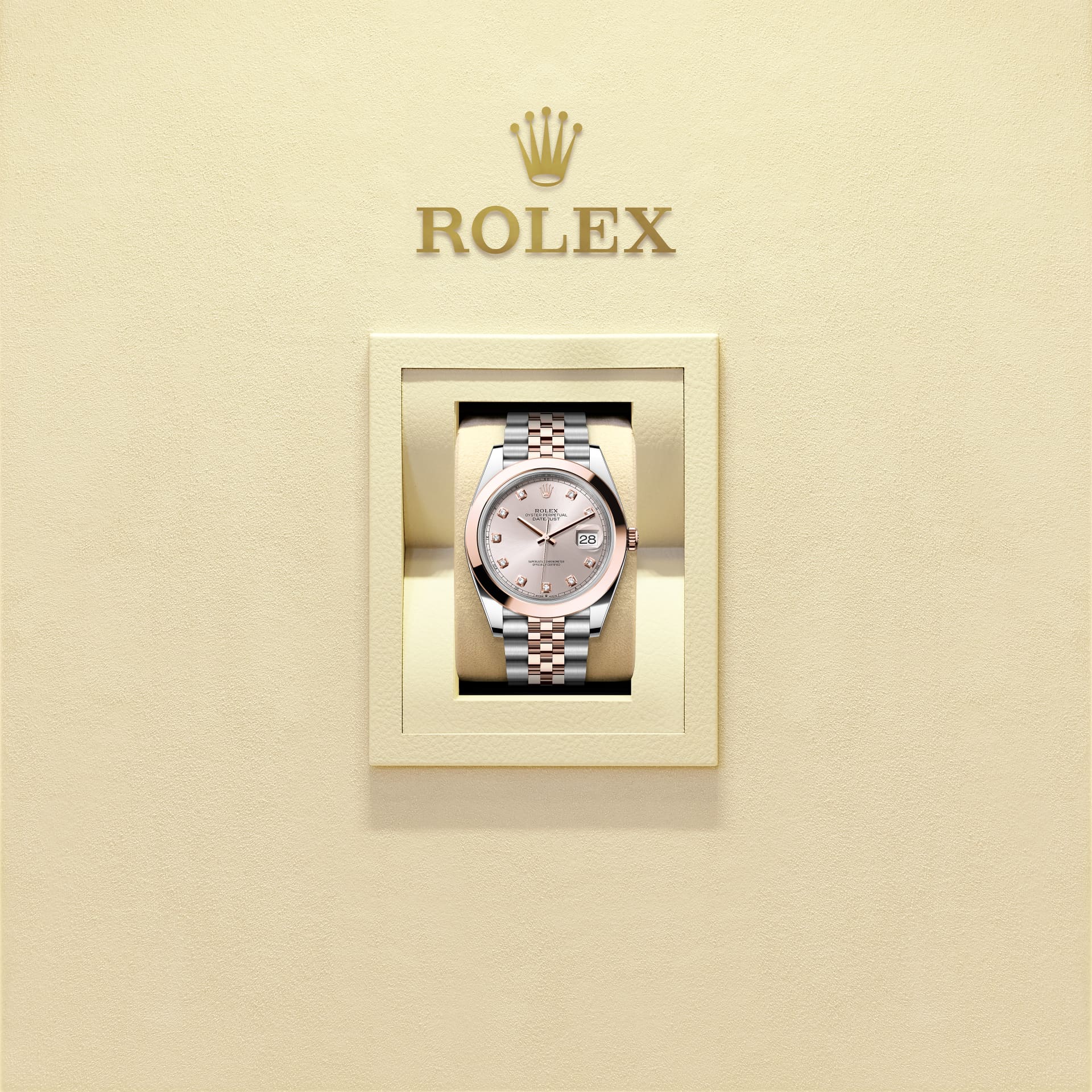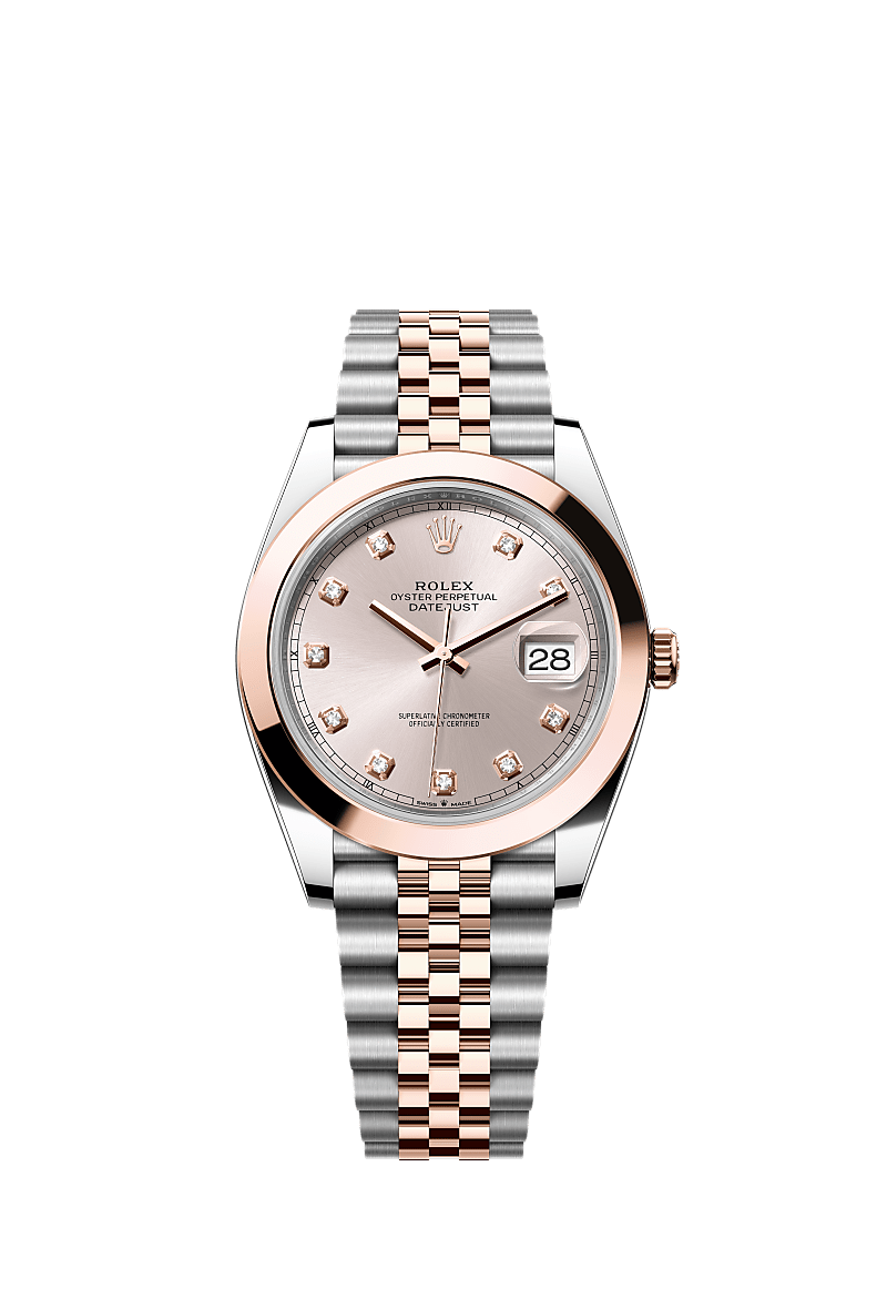 This Oyster Perpetual Datejust 41 in Oystersteel and Everose gold features a Sundust, diamond-set dial and a Jubilee bracelet.