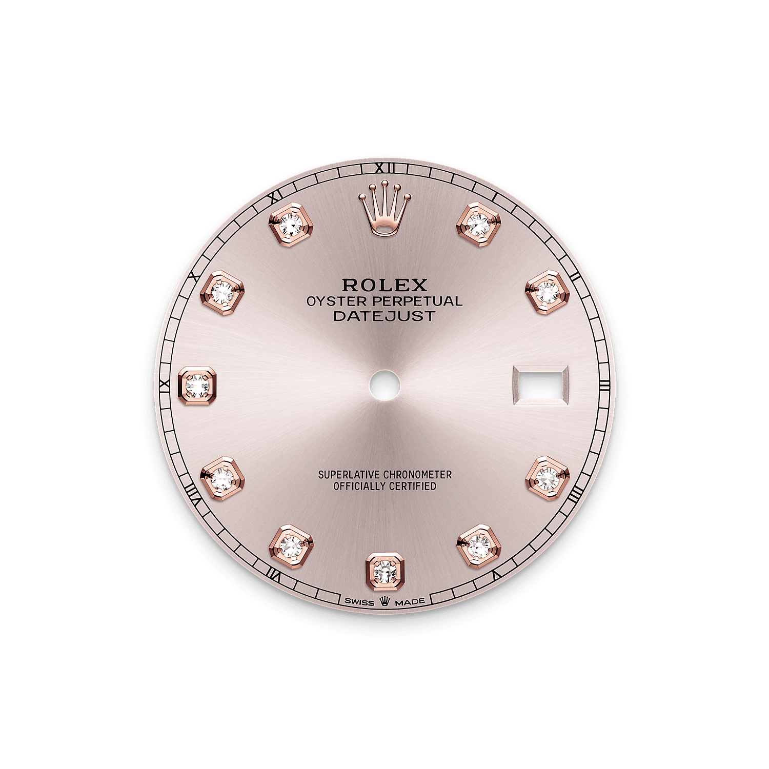 This dial features diamonds in 18 ct gold settings. The sunray finish creates delicate light reflections on many dials in the Oyster Perpetual collection. It is obtained using masterful brushing techniques that create grooves running outwards from the centre of the dial.