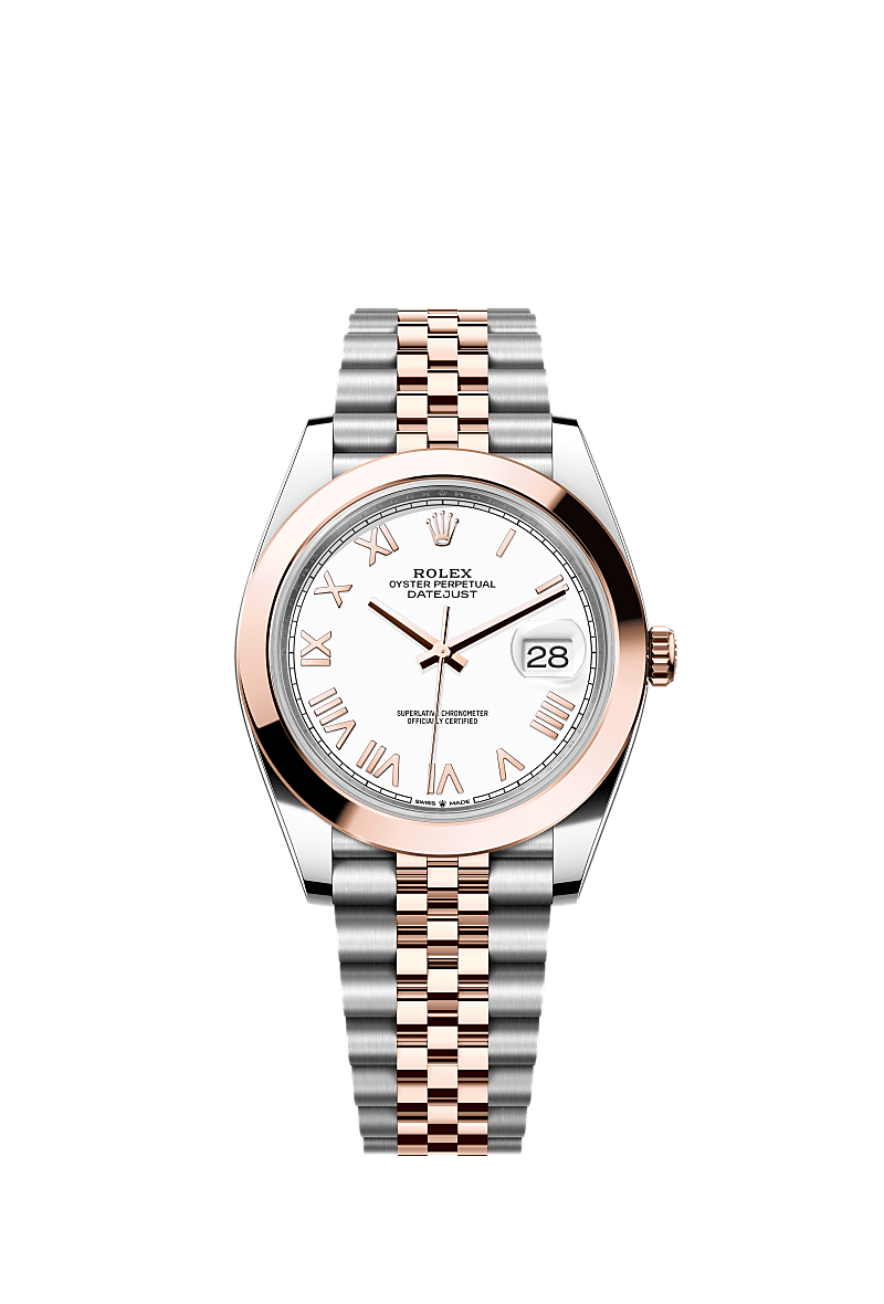 This Oyster Perpetual Datejust 41 in Oystersteel and Everose gold features a white dial and a Jubilee bracelet.