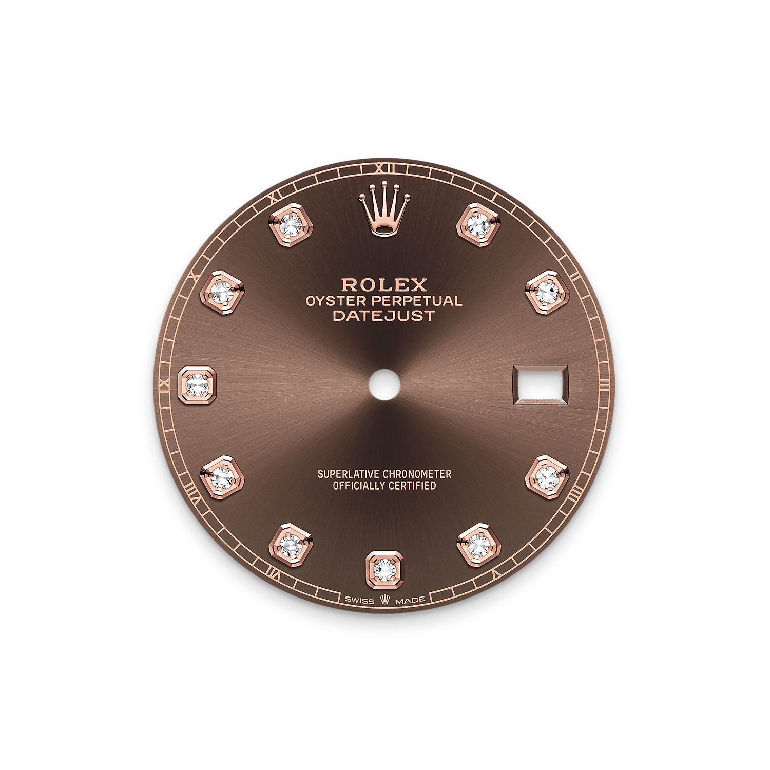 This dial features diamonds in 18 ct gold settings. The sunray finish creates delicate light reflections on many dials in the Oyster Perpetual collection. It is obtained using masterful brushing techniques that create grooves running outwards from the centre of the dial.