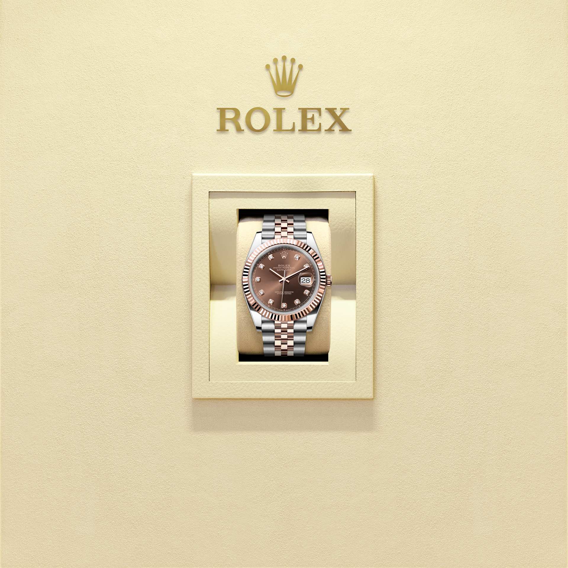 This Oyster Perpetual Datejust 41 in Oystersteel and Everose gold features a chocolate, diamond-set dial and a Jubilee bracelet.