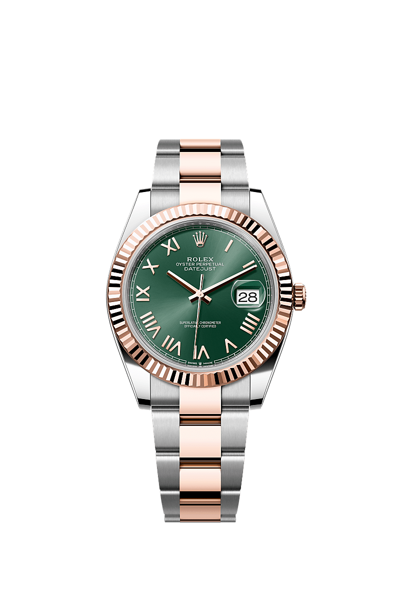 This Oyster Perpetual Datejust 41 in Oystersteel and Everose gold features a mint green dial and an Oyster bracelet.
