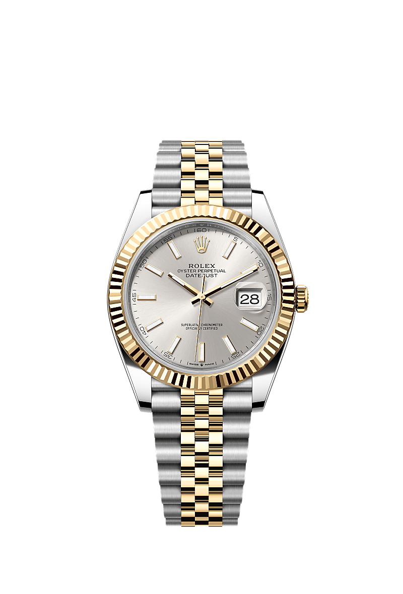 This Oyster Perpetual Datejust 41 in Oystersteel and yellow gold features a silver dial and a Jubilee bracelet.
