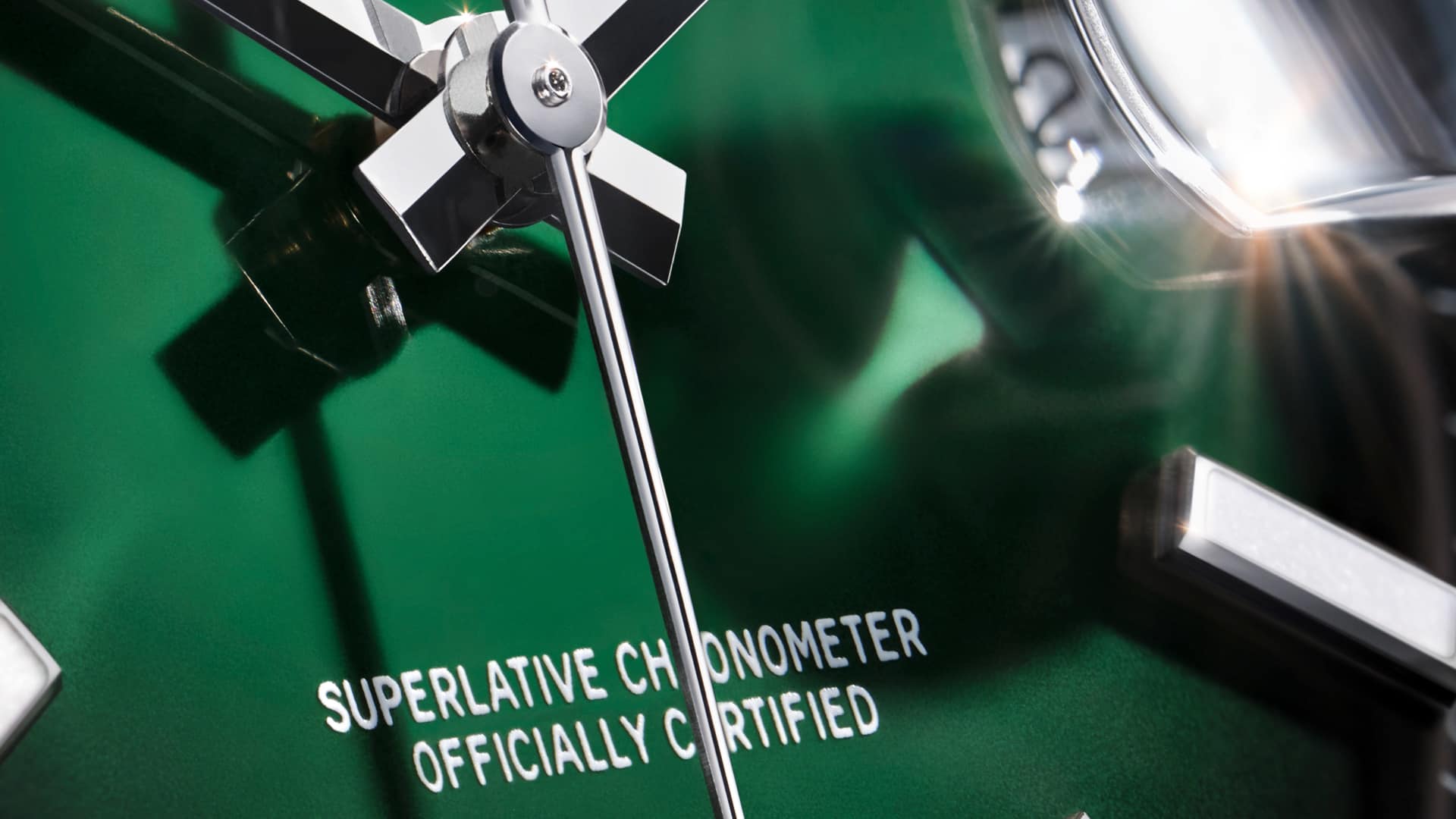 Green lacquer is applied to the base plate, then, as with all ombré dials, the colour gradient is created by spraying black lacquer in concentric motions. The white inscriptions stand out particularly clearly, featuring Chromalight index hour markers.