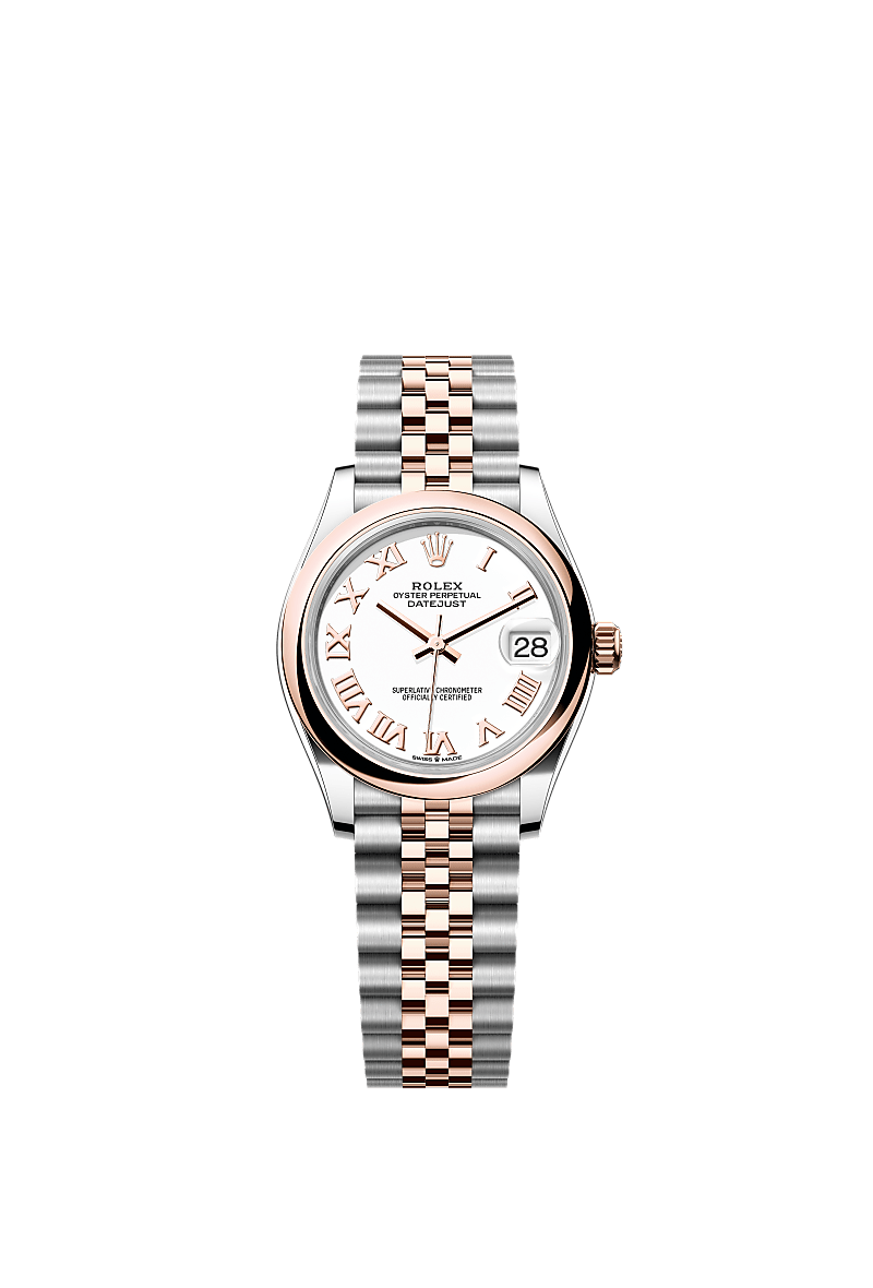 This Oyster Perpetual Datejust 31 in Oystersteel and Everose gold features a white dial and a Jubilee bracelet.