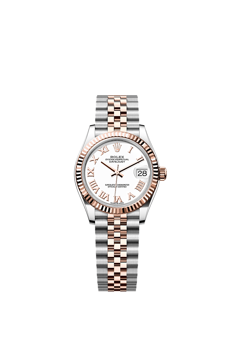 This Oyster Perpetual Datejust 31 in Oystersteel and Everose gold features a white dial and a Jubilee bracelet.