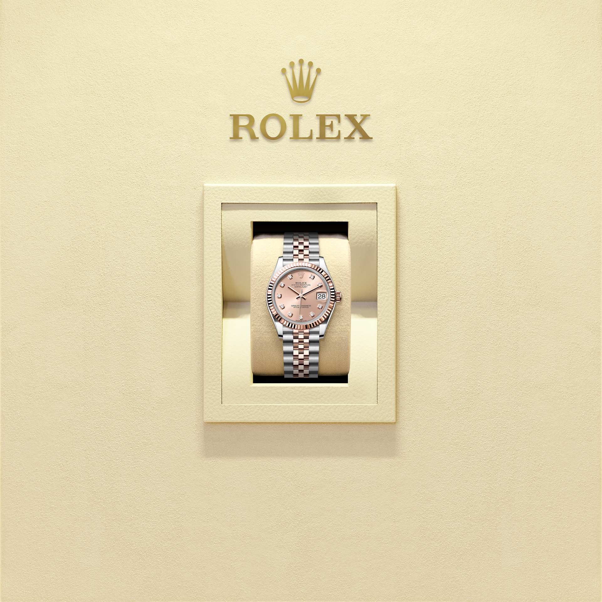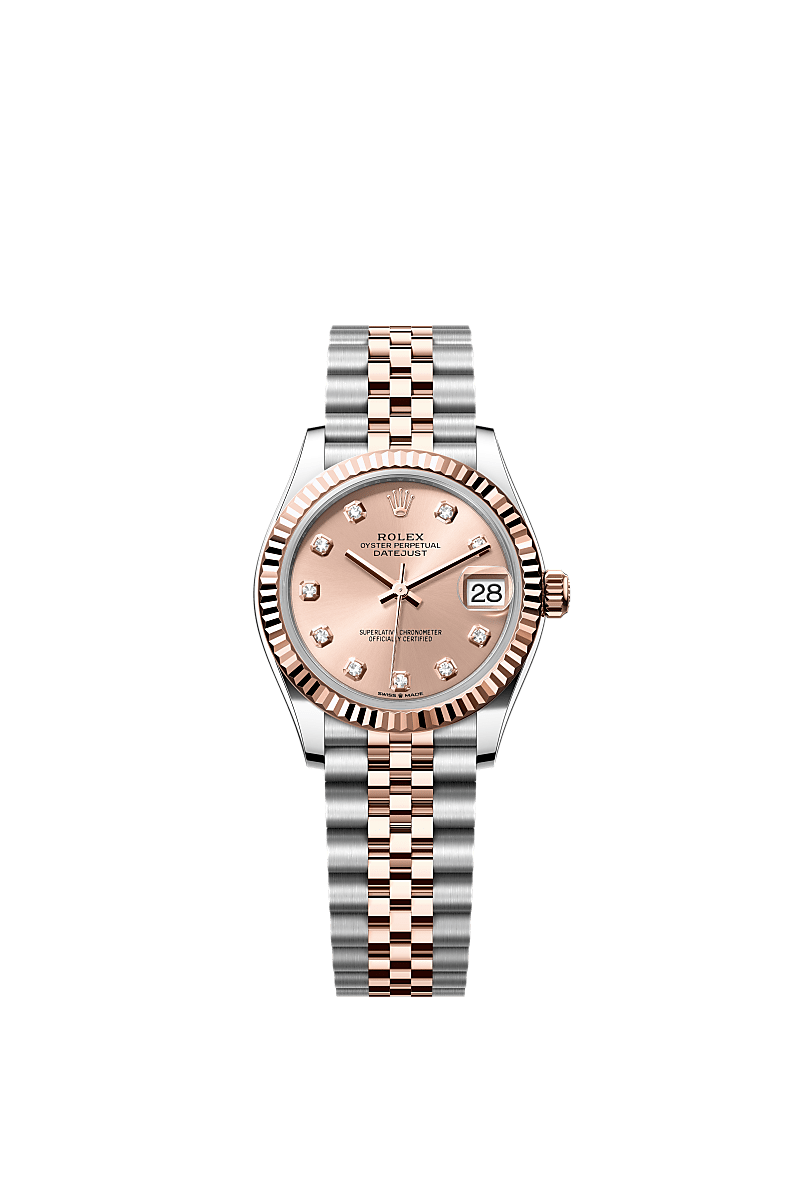 This Oyster Perpetual Datejust 31 in Oystersteel and Everose gold features a rosé colour, diamond-set dial and a Jubilee bracelet.