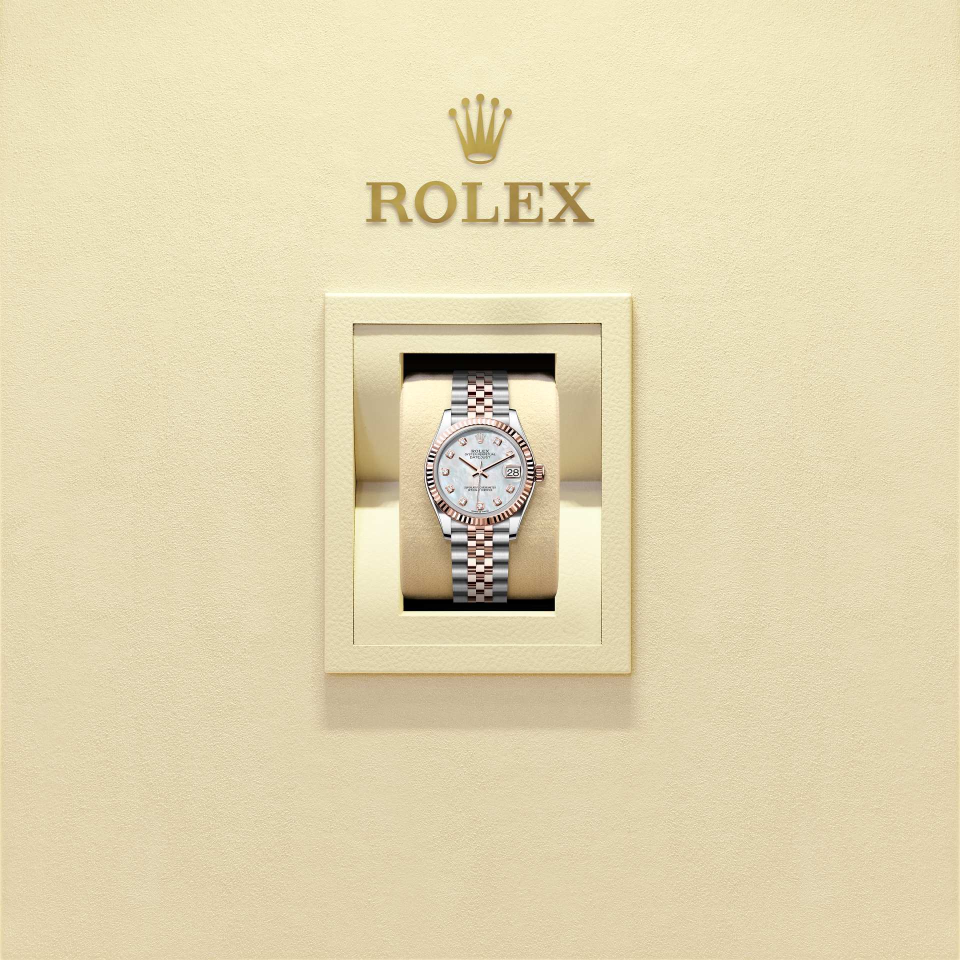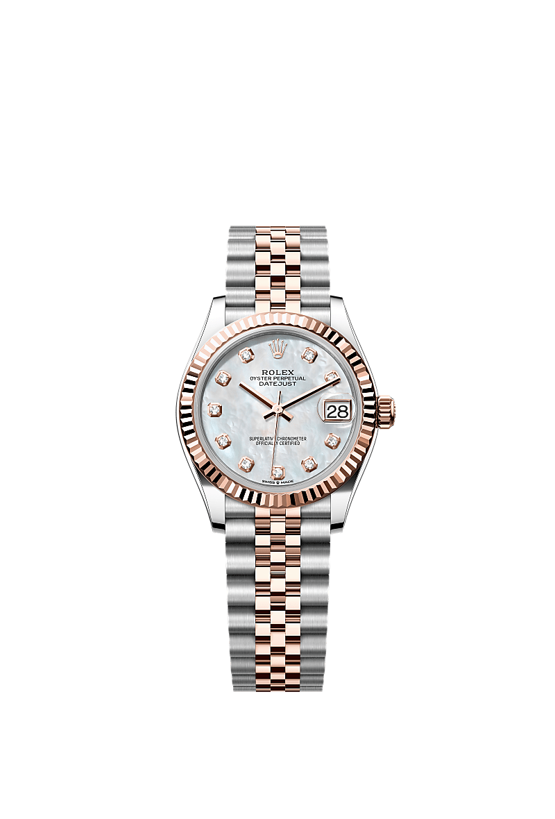 This Oyster Perpetual Datejust 31 in Oystersteel and Everose gold features a white mother-of-pearl, diamond-set dial and a Jubilee bracelet.
