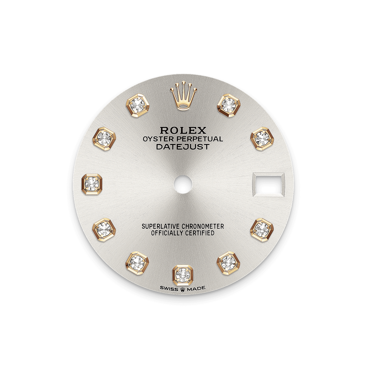 This dial features diamonds in 18 ct gold settings. The sunray finish creates delicate light reflections on many dials in the Oyster Perpetual collection. It is obtained using masterful brushing techniques that create grooves running outwards from the centre of the dial.