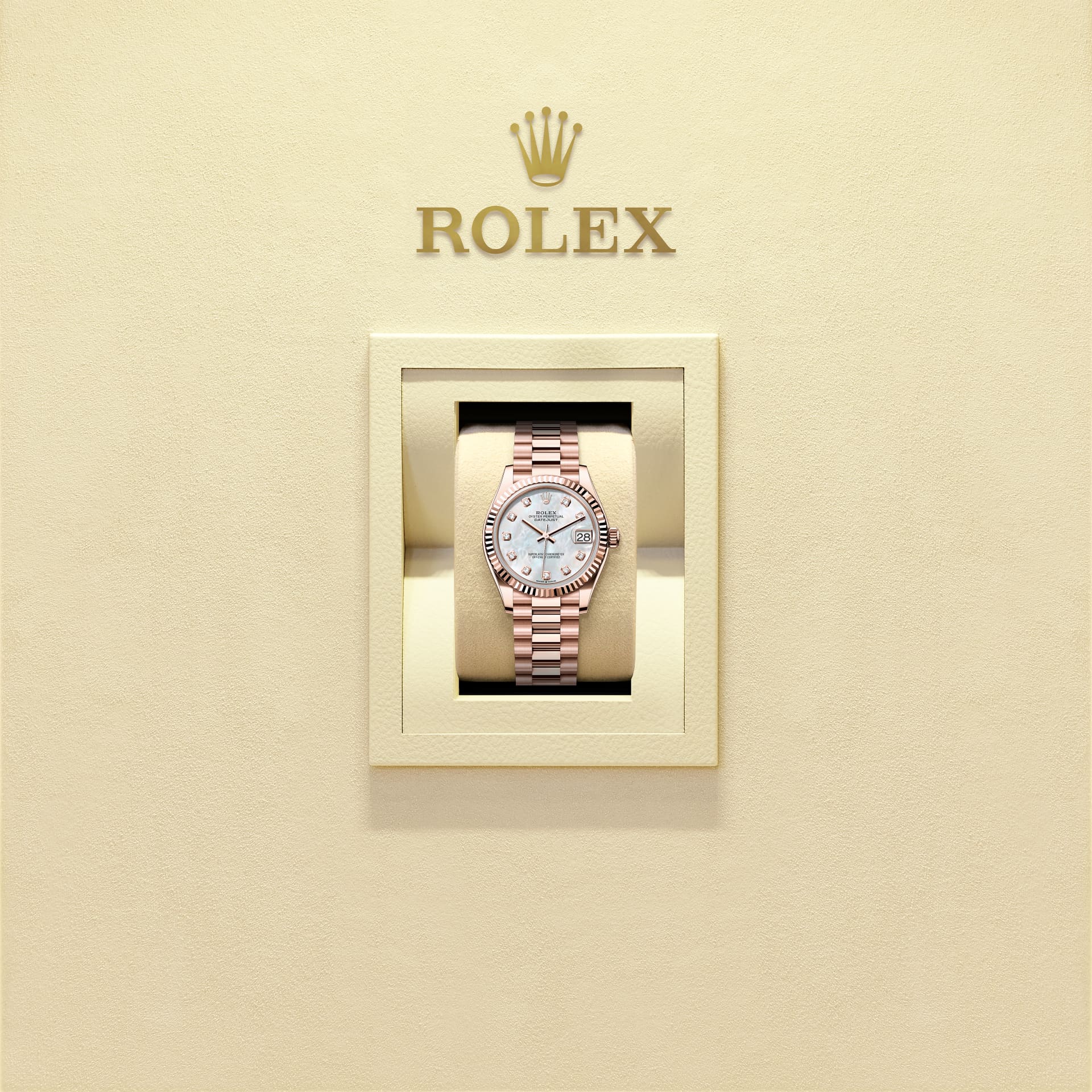 This Oyster Perpetual Datejust 31 in 18 ct Everose gold features a white mother-of-pearl, diamond-set dial and a President bracelet.